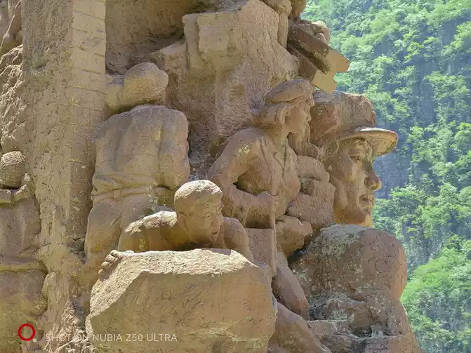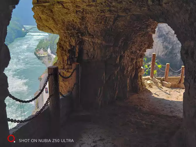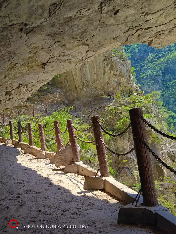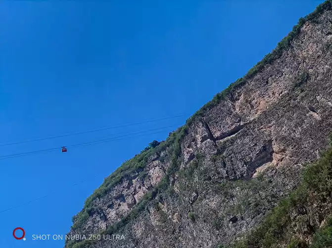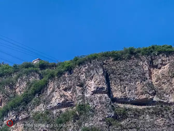 Standing in the position of the canteen, I used the 85mm and 170mm focal lengths of my mobile phone to take two pictures of the trail carved out next to the cliff when I approached the top of the mountain, which was indeed quite difficult. Because it took 2-3 hours to go back and forth from the canteen to the top of the mountain, it was close to 5 p.m., and after comprehensive consideration, I had to turn back halfway, leaving some regrets to conquer early in the morning next time.