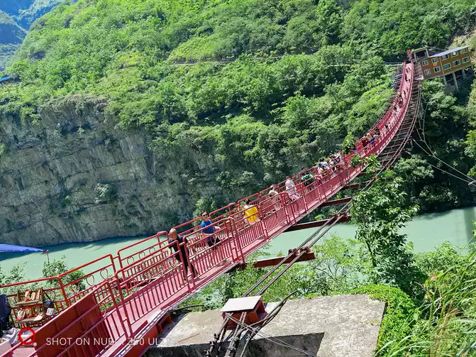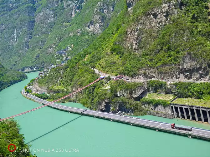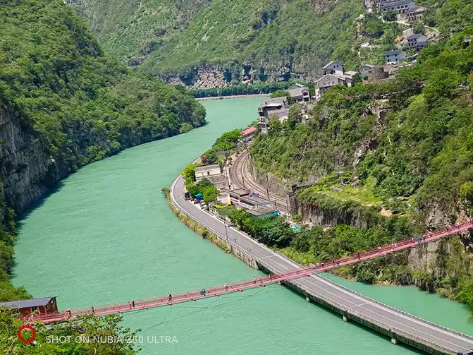 After crossing the bridge and walking for more than 100 meters, you can reach the Canyon Cliff Village, where there is the best observation deck overlooking the Chrysostom River, the magnificent water highway and the concentric bridge across the moat are intertwined, and the Dadu River extending into the distance is like a jewel-like turquoise color, deep and mysterious, and you will really sigh at the scene and super shocking.