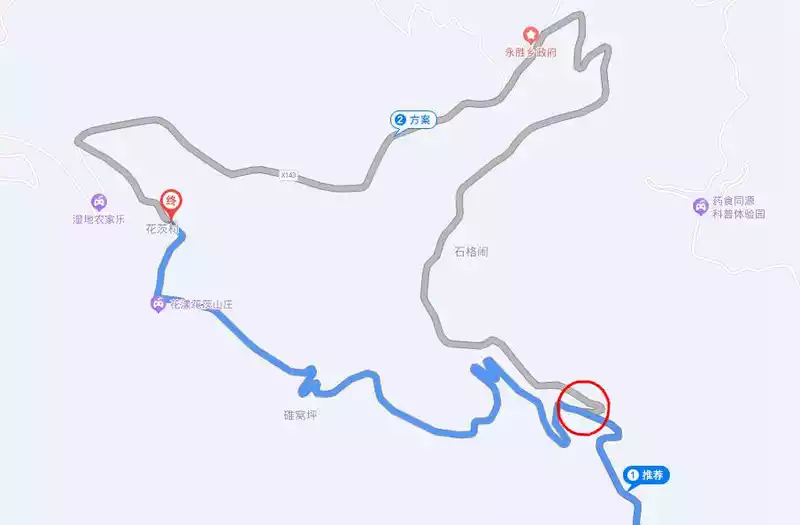 The red circle in the picture below is the video above at 3:50 where I parked and left, and you can see the difference between following the "Huajian Pass" sign and I choosing to follow the road construction sign.