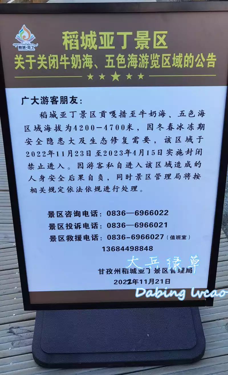 Returning to the Luorong Cattle Farm from the Milk Sea, I saw that the scenic spot issued a notice that from November 23, 2022 to April 15, 2023, the scenic spot will be closed due to winter ice and snow. We were very lucky to visit Aden on the last day of 2022.