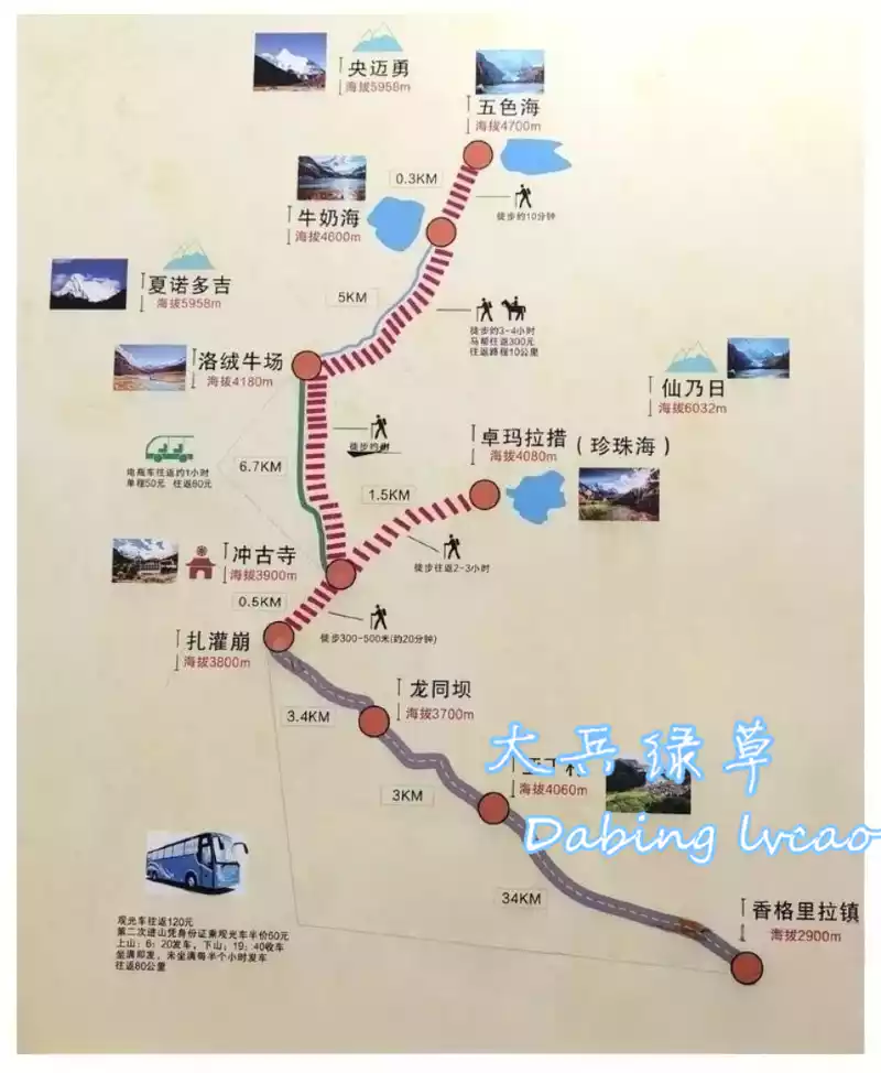 end of the sightseeing bus is Zha Guanbeng, after getting off the bus, trek 500 meters of mountain road to reach Chonggu transfer station, and transfer to an electric sightseeing bus from here to Luorong Cattle Farm six kilometers away; Turn right in the direction of Sennairi, where there are Chonggu Grassland, Chonggu Temple, and Pearl Sea.