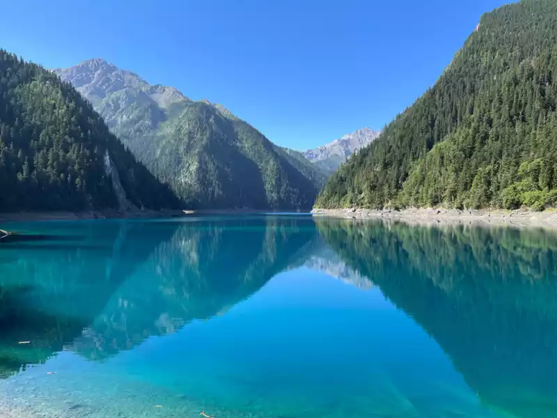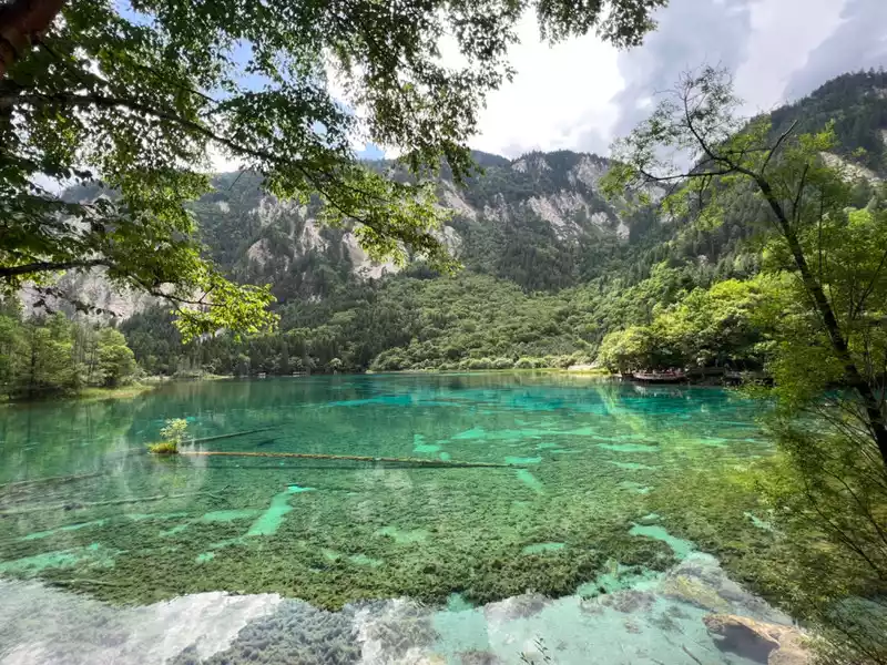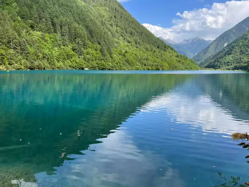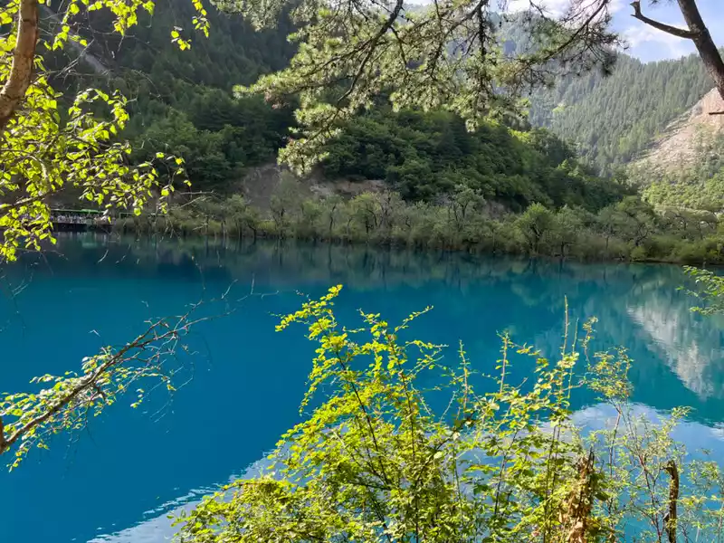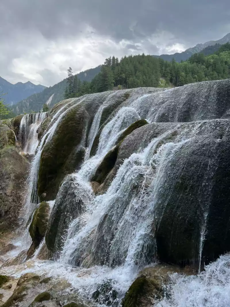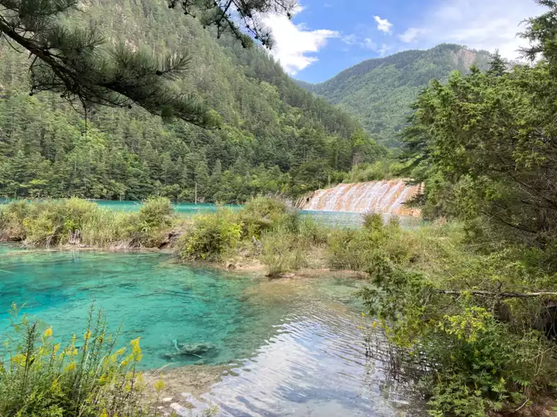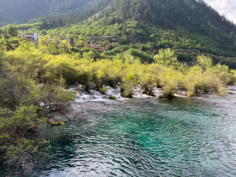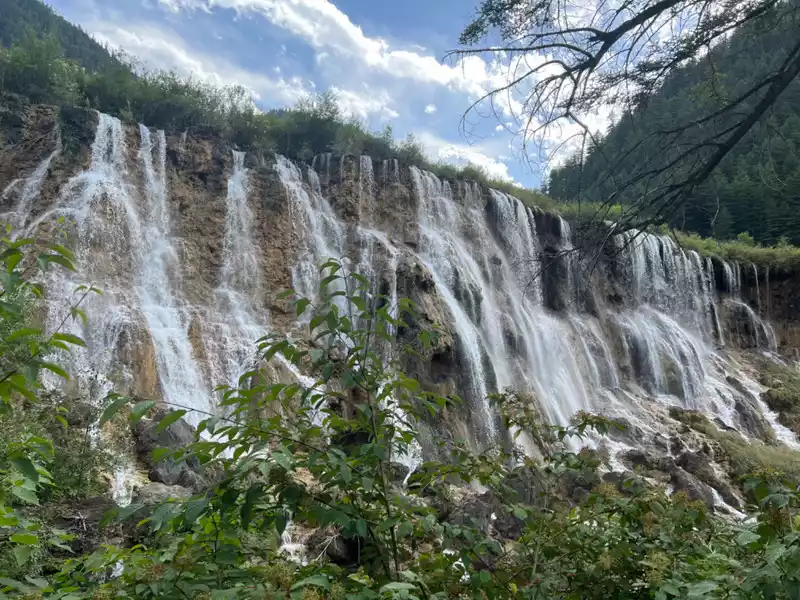 I guess the tall Nozhilang waterfall on the shore may have not collapsed in the earthquake because it had calcified.
