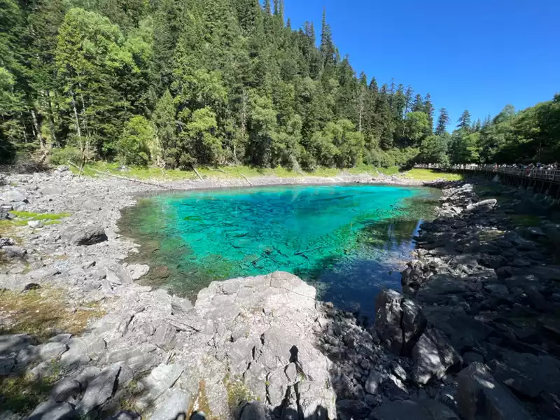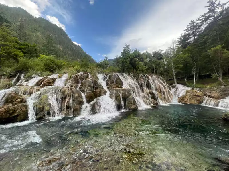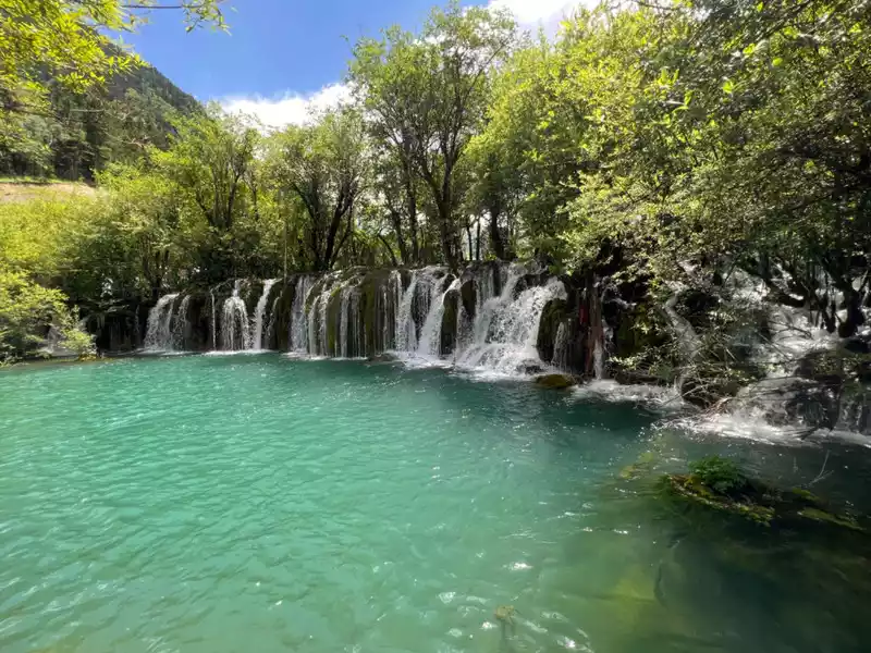 white waterfall plunges into the blue pool, creating layers of ripples. Although the waterfall of the Arrow Bamboo Sea is not high, it has a unique taste in the combination of movement and stillness.