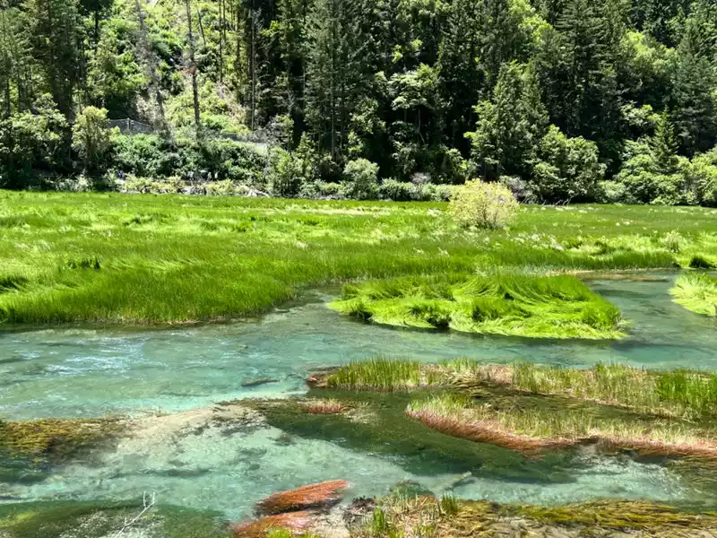 The next stop is to the Rizegou head on the right, the towering trees in the primeval forest emit rich negative oxygen ions, and the fragrance of the trees is refreshing, and I don't want to leave!