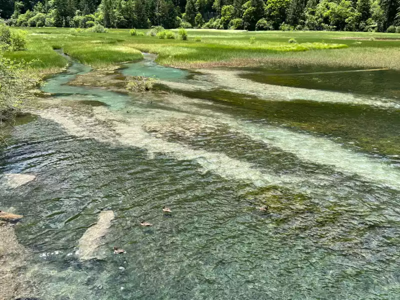 Three or two wild ducks wandered freely in the emerald lake, squinting at the tourists on the shore from time to time.