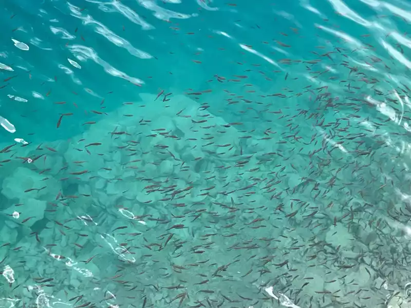 Perhaps accustomed to seeing tourists, the fish of the Panda Sea enthusiastically chase pedestrians.