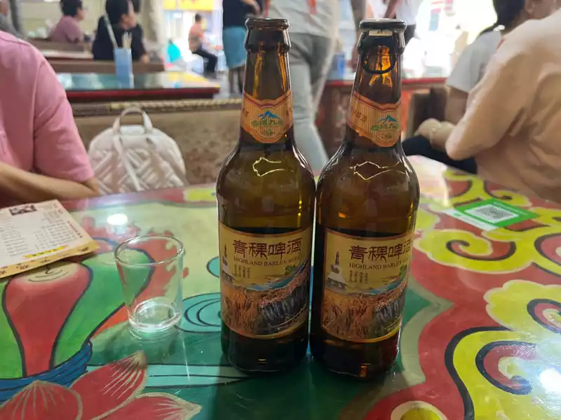 Walking out of the gate of the scenic spot, I called the innkeeper and came to pick us up in a while. Back to the inn, go straight to the barbecue restaurant below, and first serve two bottles of highland barley beer to relieve fatigue.