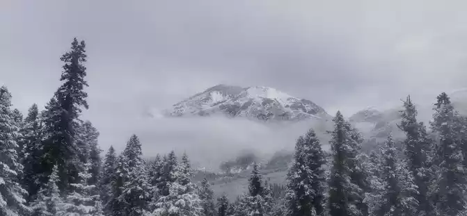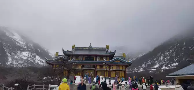 The ropeway goes up the mountain, on Wanglongping, looking down at the whole picture of Huanglong: the sky is cloudy, there is white snow, and the entire Huanglong Scenic Area is between these two mountains.