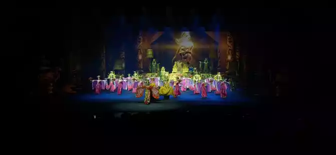 The large-scale song and dance "Jiuzhai Eternal Love" is divided into "The Legend of Jiuzhai", "Ancient Qiang War Song", "Han-Tibet Peace", "Great Love Without Borders", and "Heaven and Earth Auspicious"and other scenes. The beautiful and mysterious Tibetan and Qiang songs and dances take you on a journey through time and space, and the glorious Tang Dynasty Palace shows the feat of Princess Wencheng's marriage between China and Tibet. 5D reality and high-tech means reproduced the tragic scene of the 5.12 Wenchuan earthquake in Aba Prefecture, with landslides and ground cracks, houses collapsing, the entire theater and thousands of seats shaking strongly, and the 3,000 cubic meters of flood pouring down like a sea...... One by one, the real stories and touching pictures show the boundless love of the Chinese nation for earthquake relief. In the 1-hour performance, 300 actors, 360-degree panoramic performances, and tens of thousands of sets of stage machinery interacted with the audience in an all-round way, using the high-tech of sound and light and electrical and the space creativity of heaven and earth, completely breaking the boundaries of art genres, a visual feast, shocking!
