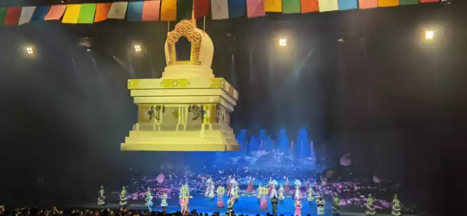 After the earthquake disaster, the peaceful Sanskrit sound soothes people's hearts. I saw the magnificent Tibetan-style white pagoda slowly descending from the sky, and the lotus lifting platform with beautiful meanings rose on both sides of the moving audience, and the lama holding the prayer wheel sang prayers. Looking up at the top of the theater, colorful prayer flags fluttered in the air, and the performance came to an end with auspicious sounds and applause.