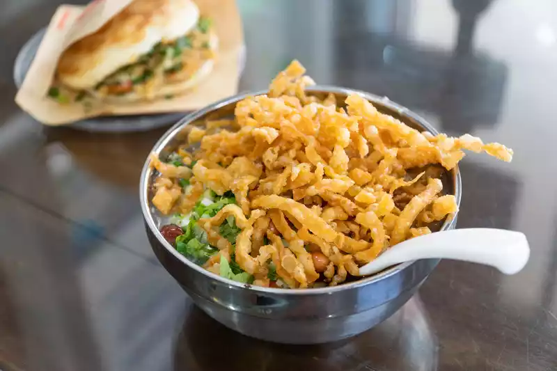 Walking in the streets and alleys of Shizhong District, Leshan City, you will find that food is everywhere. I heard that many tourists from Sichuan Province come to Shizhong District, Leshan City, just for food. The most popular is Zhanggongqiao Delicious Street, where you can eat from morning to night. As an out-and-out food capital, the food in Shizhong District, Leshan City will definitely not disappoint you. A bowl of ordinary tofu brain in the morning is filled with fried soybeans, fried peanuts, chives, crispy meat, umbrellas and other ingredients, and even fatty sausages, beef and other ingredients.