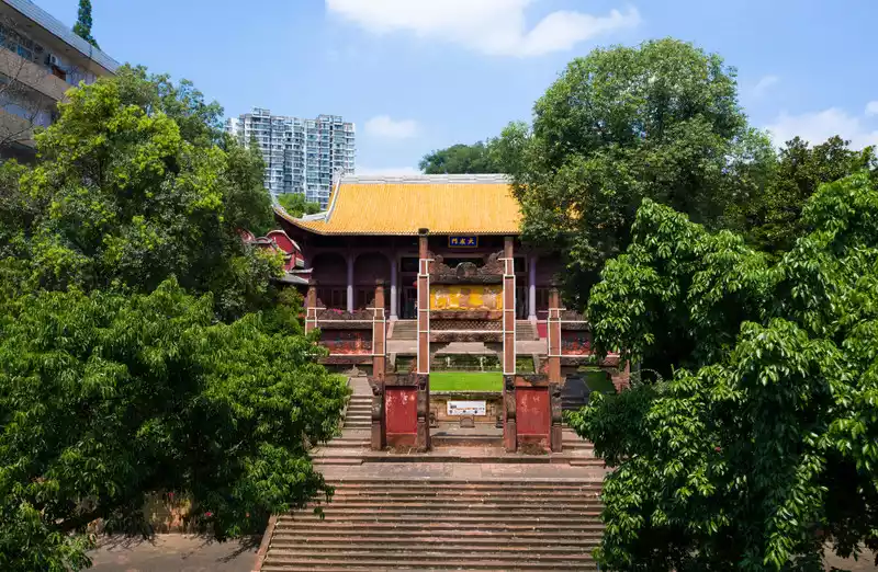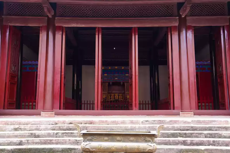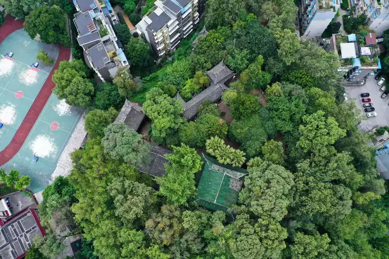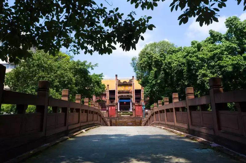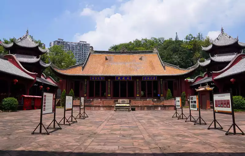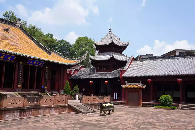 Leshan The Confucian Temple sits from west to east, with Panchi, Lingxingmen, Xianguan, Sanctuary, Mingyu Shrine, Xiangxian Shrine, East and West Halls, Zunjing Pavilion, Chongwen Pavilion, Dacheng Hall, Chongsheng Shrine and other buildings.