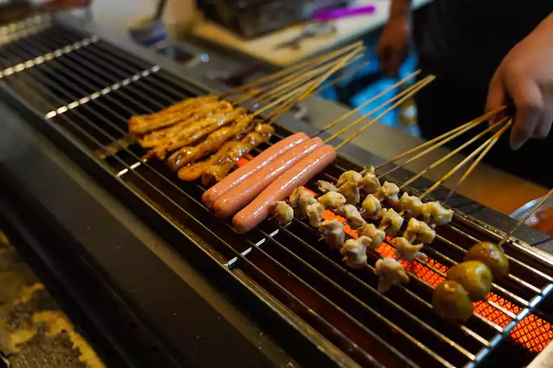 Thearoma of fried skewers with strong fireworks, all kinds of meat and vegetable skewers are immersed in the oil pan, sprinkled with flavor-enhancing seasonings, and the taste is fragrant for several streets.
