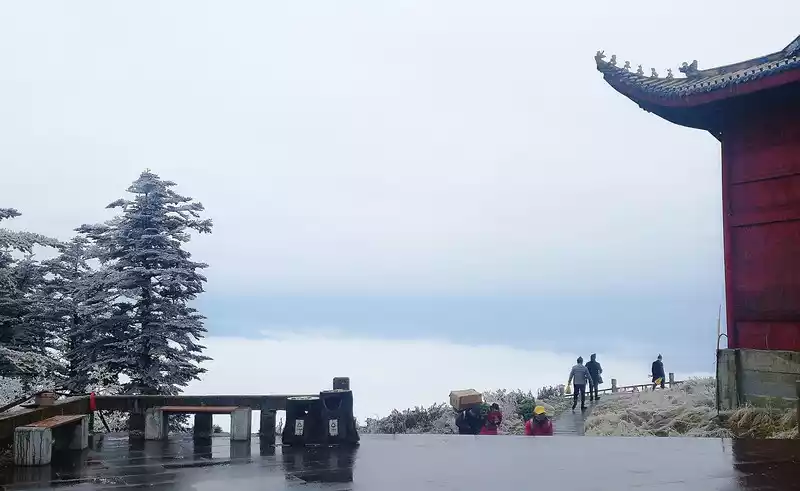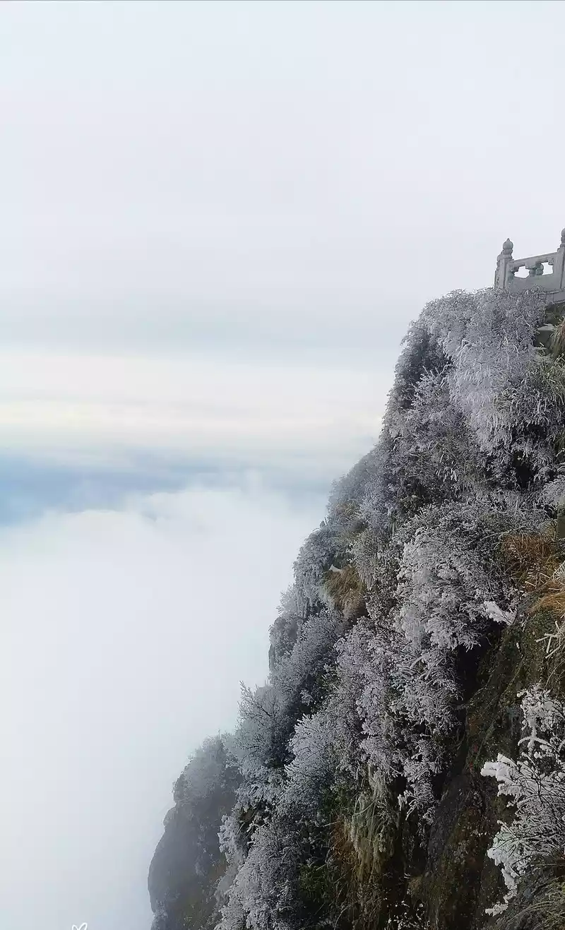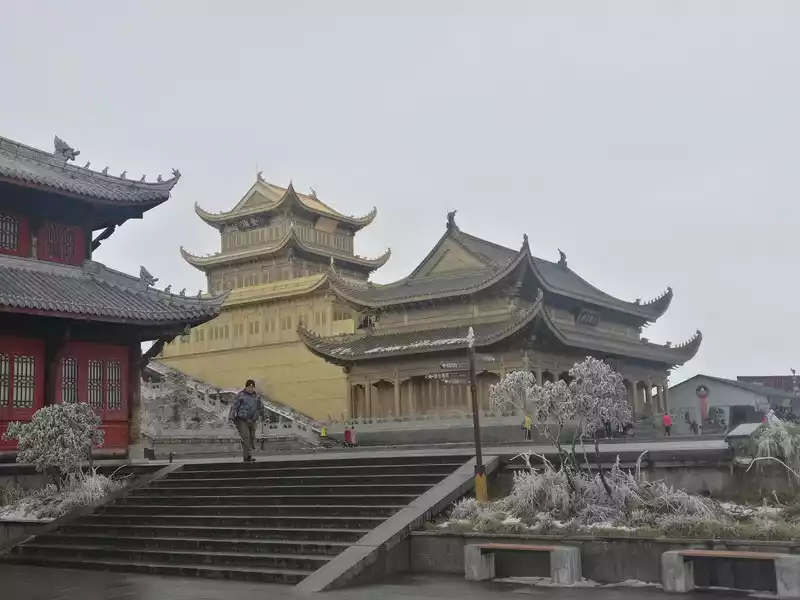 4. Climb the Golden Peak of Emei. On the first night, the tour guide Xiao Tang reminded everyone to wear all the clothes they could, and it would be very cold to climb the Golden Peak of Emei on the 6th. Despite the precautions, it was actually unexpected. As the essence of Emei, the golden top is well-deserved. Regardless of the world's largest metal complex, only the sea of clouds that permeates the mountains all year round and the rime wrapped around the branches make Mount Emei graceful and extraordinarily enchanting. Coinciding with the first melt of snow a few days ago, we put on spikes, stepped on the ice road, watched the sea of clouds, and toured the golden peak, although we were not lucky enough to encounter the colorful Buddha light of the golden dome, but in the fog, there is also a unique artistic conception, which can only be felt by personal experience. The only regret is that I have not encountered macaques in Emei, probably because it is cold.