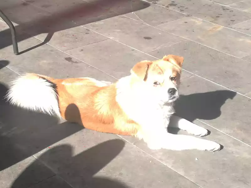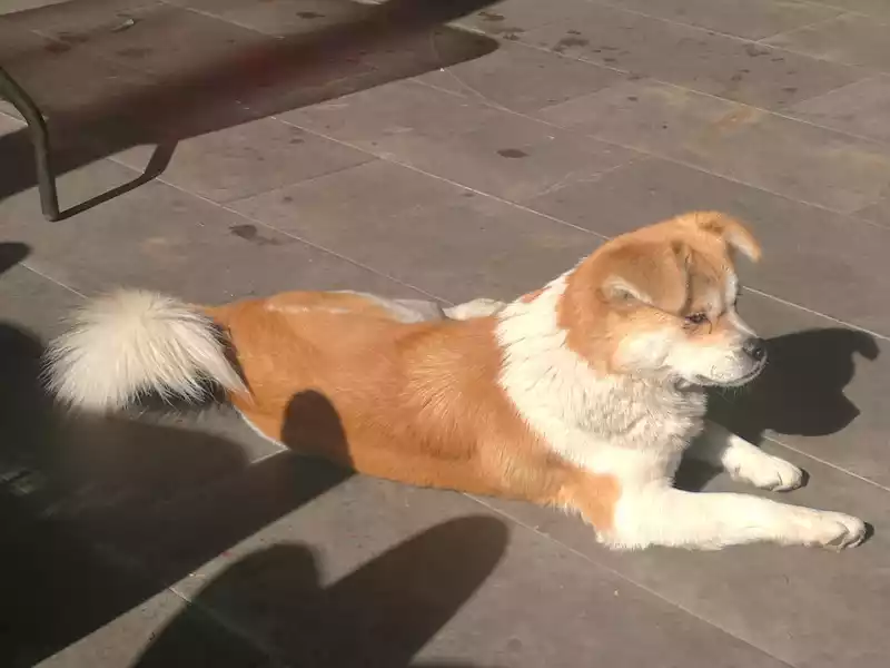 While sitting idly drinking tea, the puppy kept lying next to him basking in the sun, feeling that someone was watching, looking up, and his little eyes were very bored