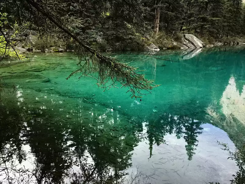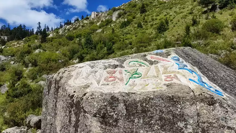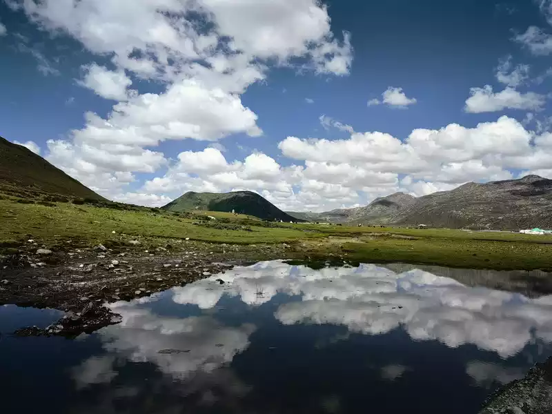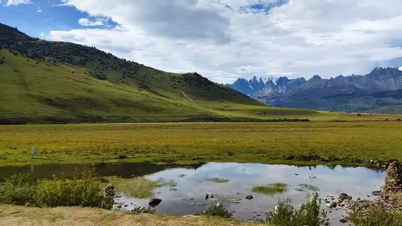 Coming out of Litang County, turn to G227 and drive to Daocheng Aden, passing through Rabbit Mountain and Haizi Mountain. Vehicles drive past the top of Haizi Mountain, there are many small lakes on the top of Haizi Mountain, blue sky, white clouds, and high mountains are reflected in Haizi Mountain to form a beautiful pattern, and there are several observation decks on Haizi Mountain, where you can stop and take pictures.
