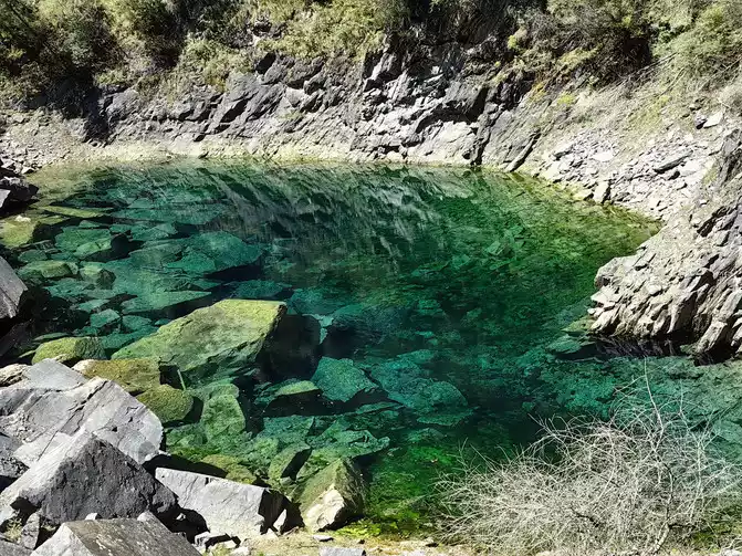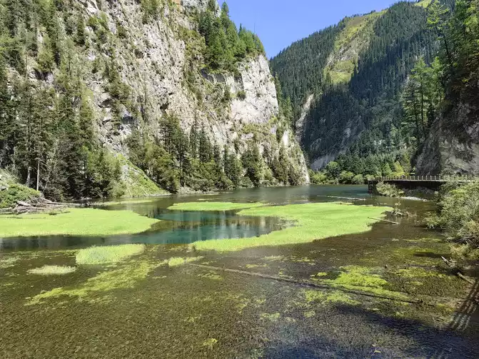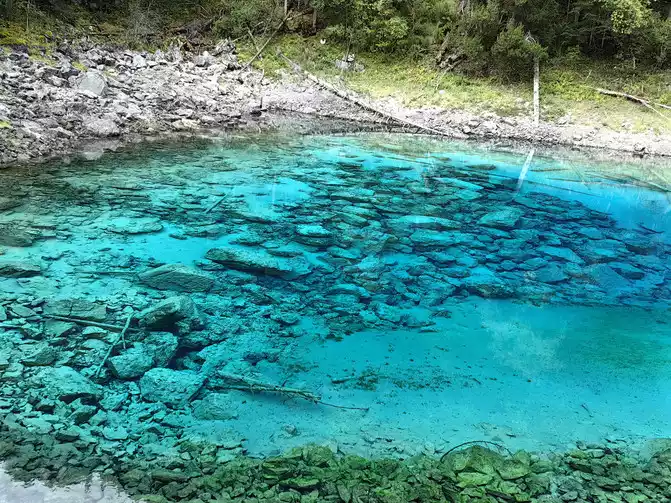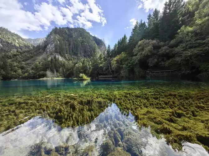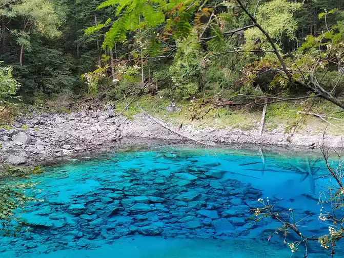 Located in the southern section of Zecha Wagou, north of the Long Sea, the Colorful Pond is famous for its beauty, colorfulness, purity and transparency, and is the smallest and most gorgeous pool in Jiuzhaigou. The water in the colorful pond is clear and transparent, and the lake surface is extremely blue, and through the water surface, you can clearly see the texture of the rocks at the bottom of the pool. The aquatic plants growing in the water contain different shades of chlorophyll, and in the lake water rich in calcium carbonate, they show different colors, and under the sunlight, the mottled light and shadow are colorful.