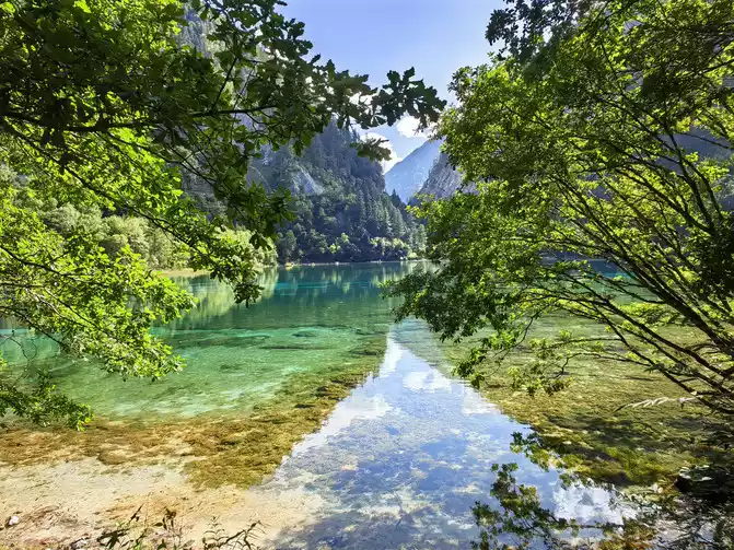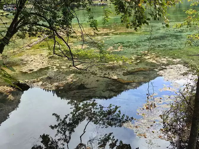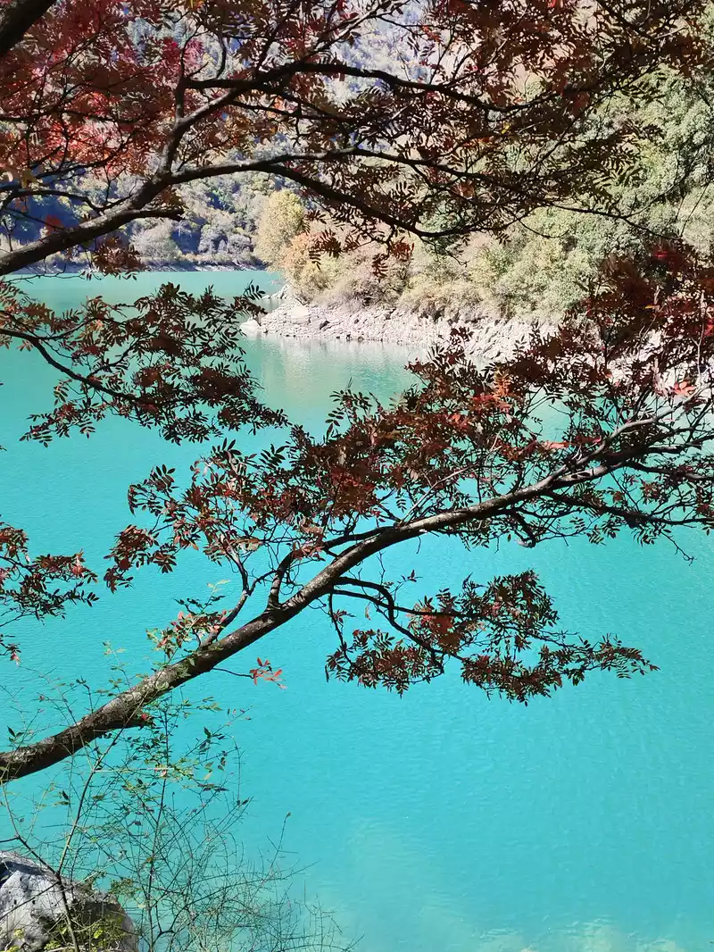 The Tiger Sea is 2,298 meters above sea level, and the lake water is blue due to travertine, from light blue to royal blue to dark blue, and the color changes evenly, which is very beautiful. Every late autumn, the upper layers of the lakeshore mountain are dyed, and the purple and red trees are reflected in the clear lake water, mottled, like the colorful tiger stripes on the tiger's body.