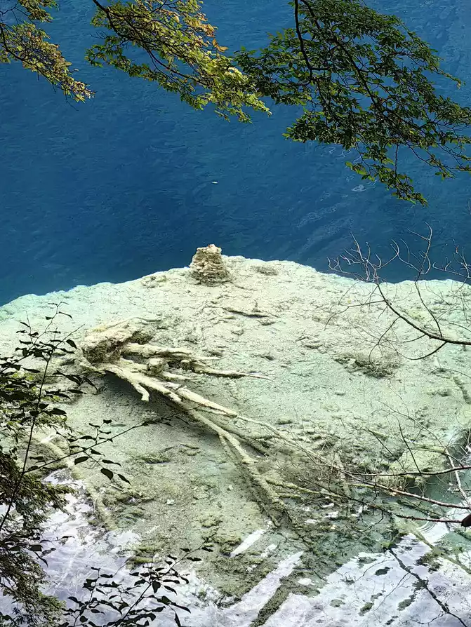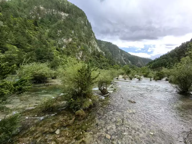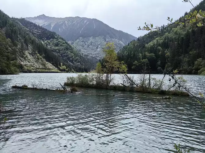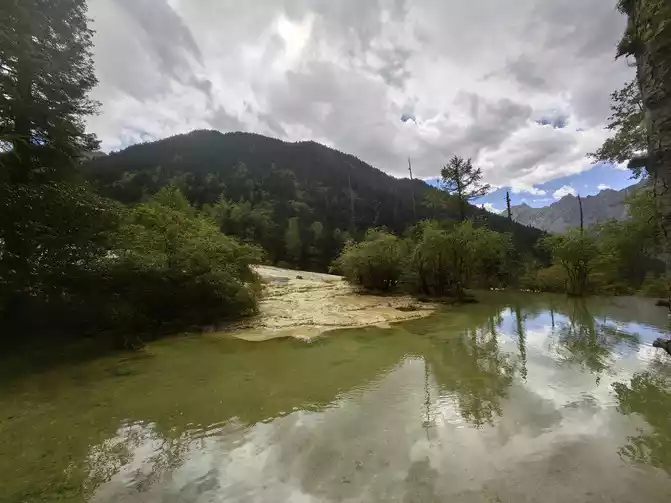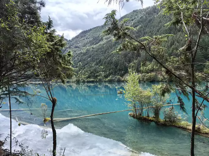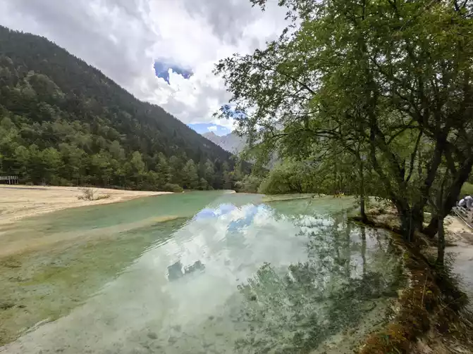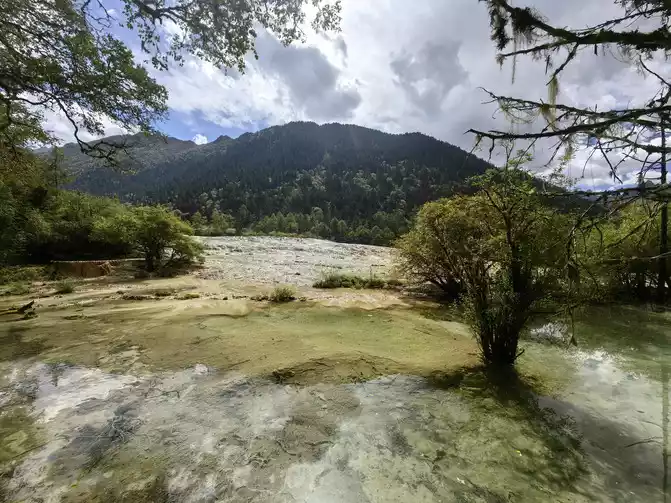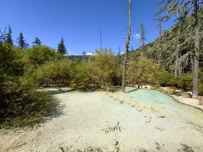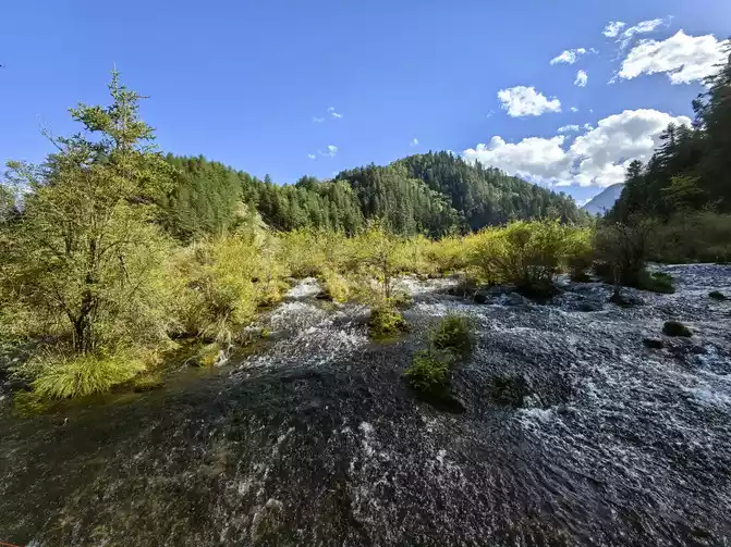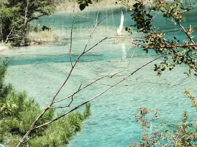 Bonsai Beach, also known as "Bonsai Sea" and "Jiazhucuo" in Tibetan, is the first beach flow landscape to enter Jiuzhaigou. The slope of the calcified beach of Bonsai Beach is soothing, the river water is clear, and a variety of plants grow on the milky travertine shoal, intertwined, one tree and one scene, each with its own interests, forming a variety of natural bonsai. These bonsai are natural, without artificial artifice and decoration, but they show a higher level of aesthetic artistic conception with their unparalleled harmony and natural beauty.