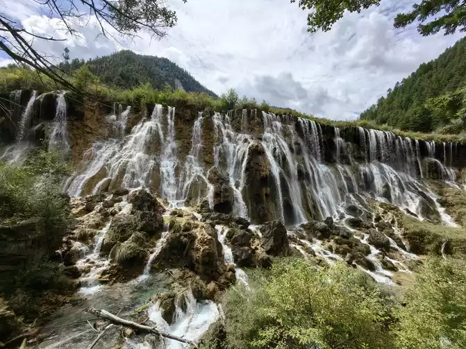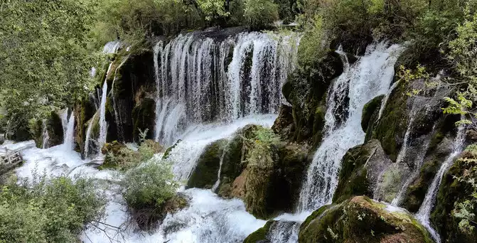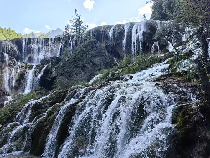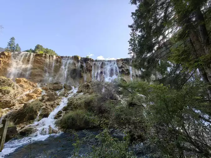 Pearl Beach Waterfall is 2,433 meters above sea level, with a height of 21 meters and a width of 270 meters. The moraine terrace left by the Quaternary glacier has been calcified to make the slope of the waterfall more towering and solid. The waterfall fell to the bottom of the valley, emitting a deafening roar, forming a raging torrent, rolling up thousands of waves, surging water mist in the emerald valley, and then rushing eastward, the sound of the water was thunderous, the mountain stream was boiling, and the momentum was majestic. This rapids is the most beautiful, the most rapid, and the loudest sound among all the rapids in Jiuzhaigou.
