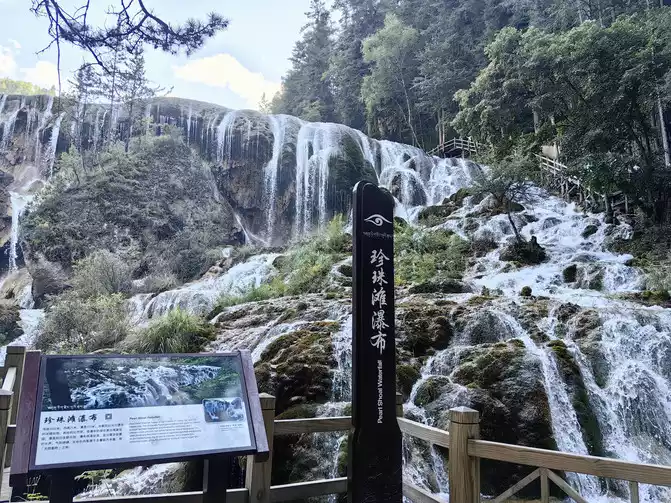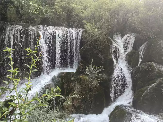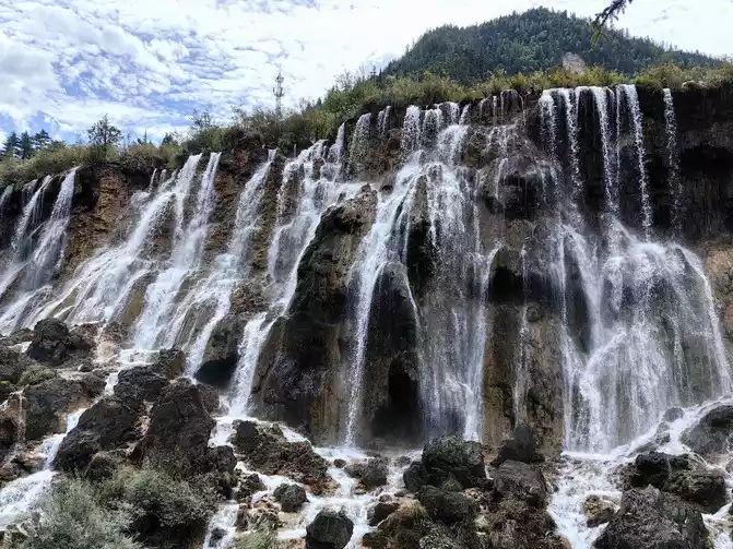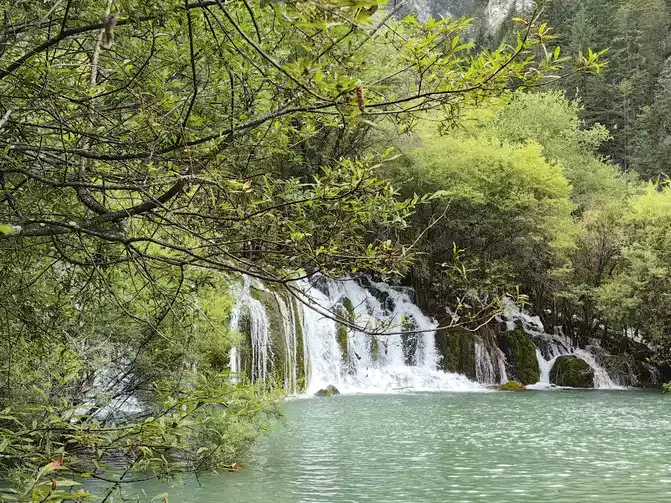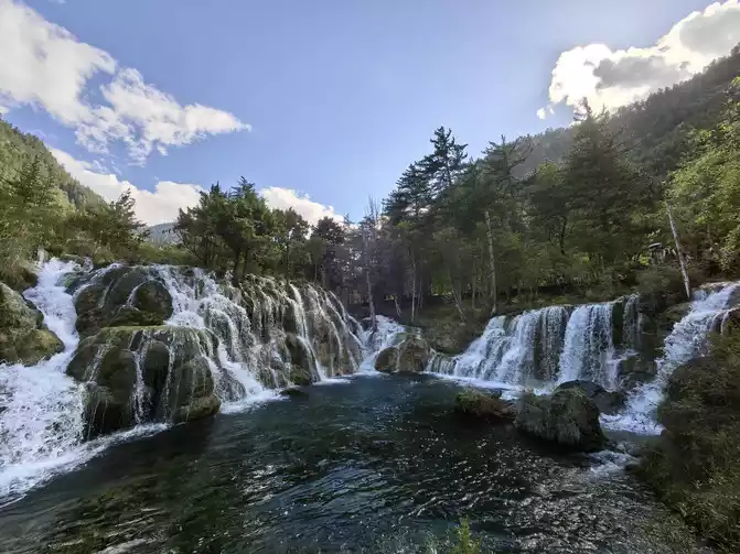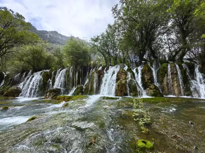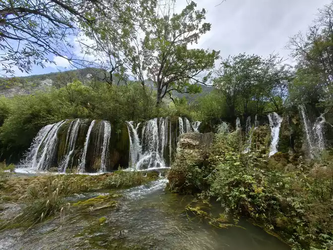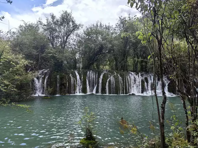Shuzheng Waterfall is located next to the road in front of Shuzhengzhai, at an altitude of 2,295 meters, which is the first waterfall seen in the ditch and the smallest of the four major waterfalls in Jiuzhaigou. The waterfall is in the shape of a forward-raised arc and is composed of many waterfalls connected end-to-end, forming a multipolar round waterfall.
