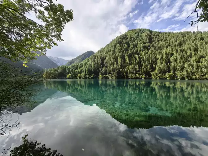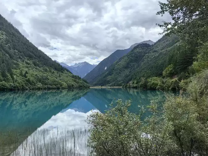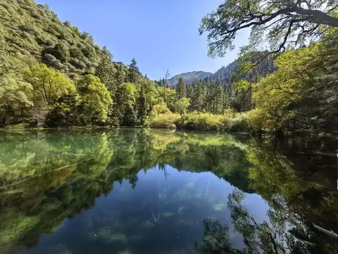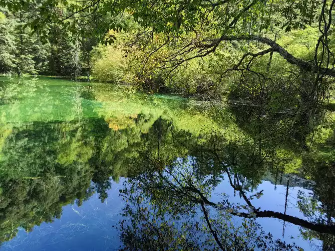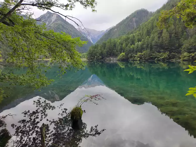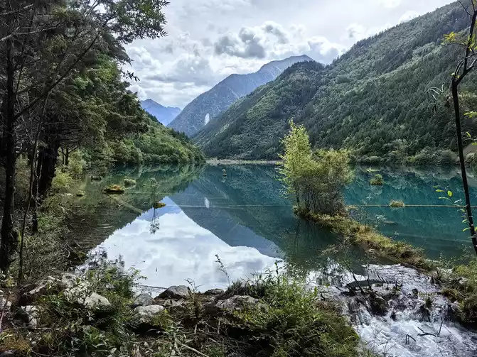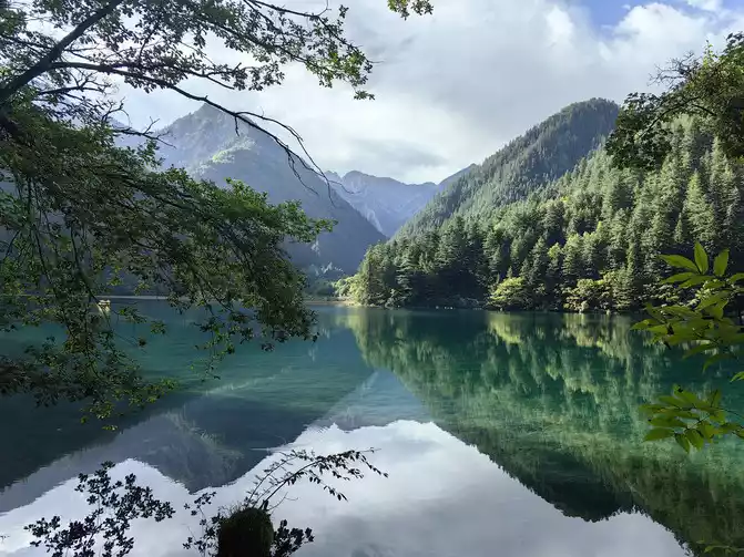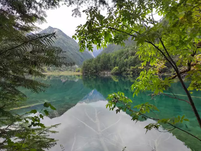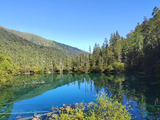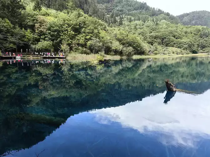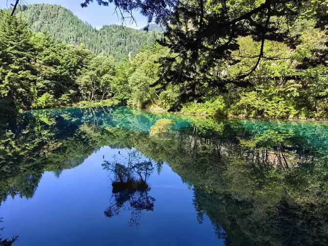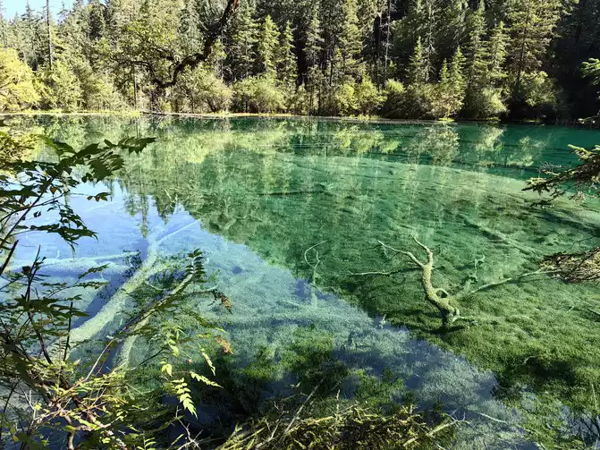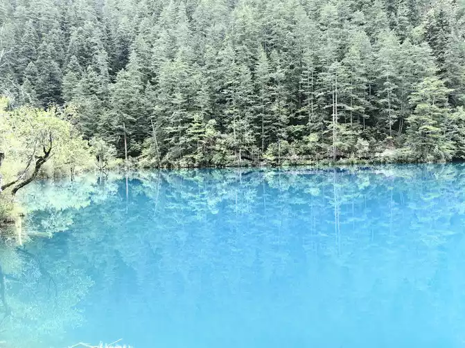 Jinghai is one of the famous attractions in Jiuzhaigou, the lake is narrow and long, about one kilometer long, surrounded by trees. The water surface is as flat as a mirror, hence the name. Whenever the morning light is first dewed or the morning glow is dyed, the blue sky, white clouds, distant mountains, and nearby trees all include the seabed, and the landscape in the sea has clear lines and bright colors.