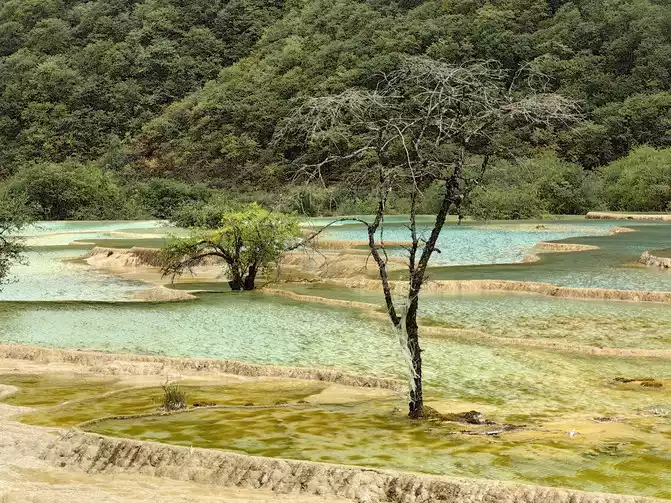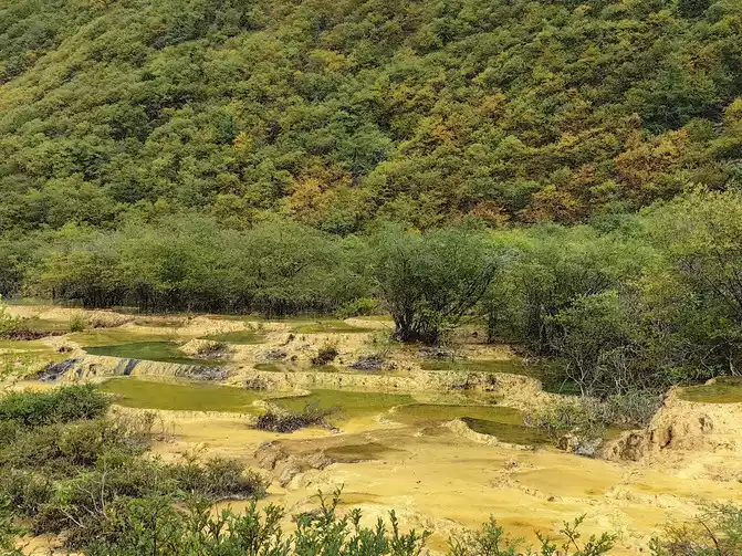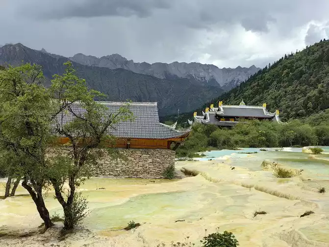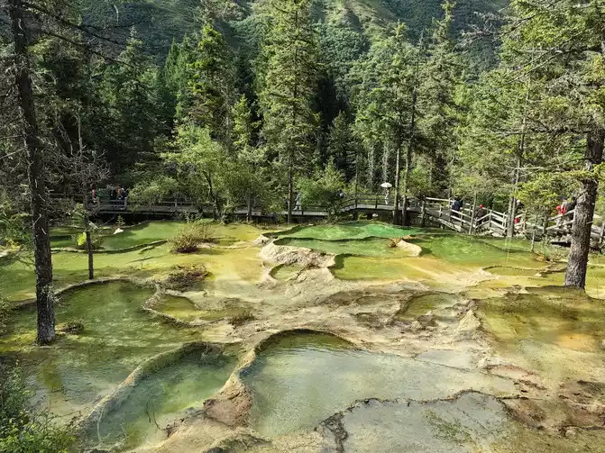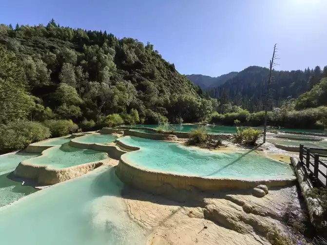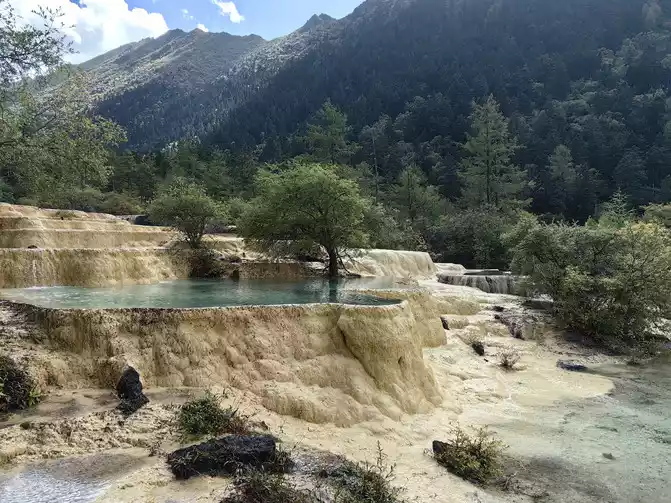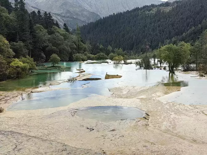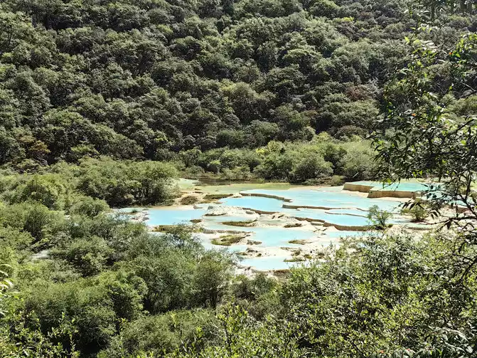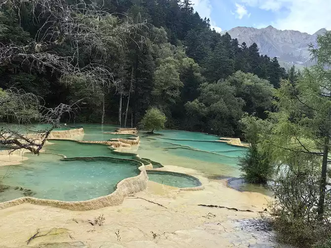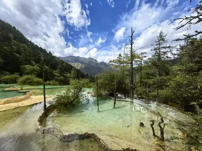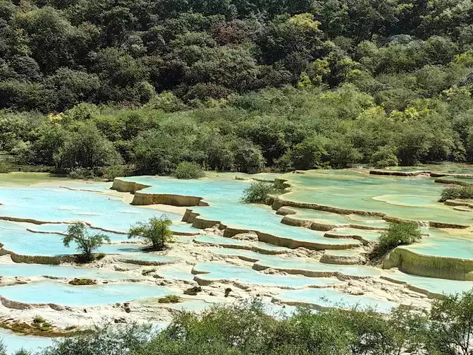 Colorful pools are a group of calcified color pools, with a total of 693 calcium pools, countless pieces of different sizes, and color pools of different shapes are like watercolor boards full of various colorful pigments, blue-green, sea blue, light blue, etc., which are gorgeous and wonderful. Walking by the pool, the green mountains are emerald, and the 5,588-meter-high main peak of Minshan Mountain, Xuebaoding, stands majestically in front of you.