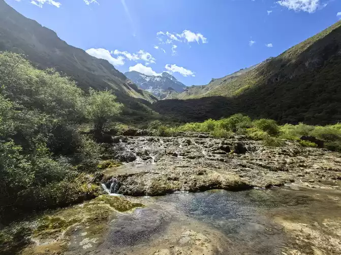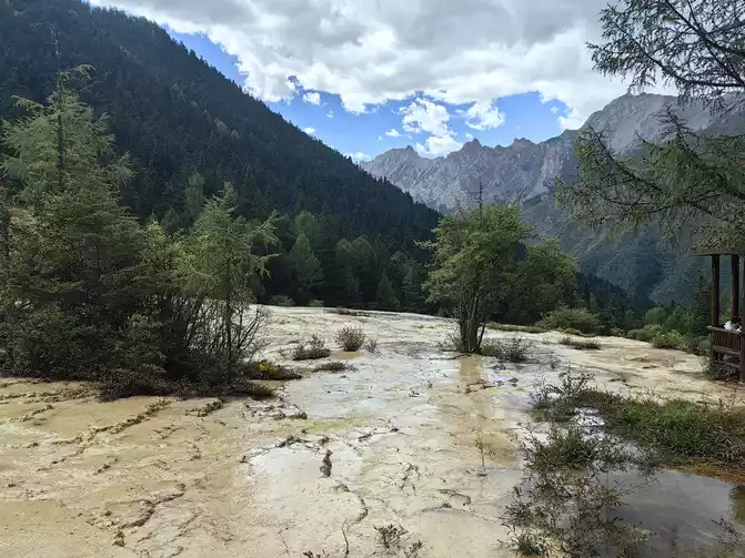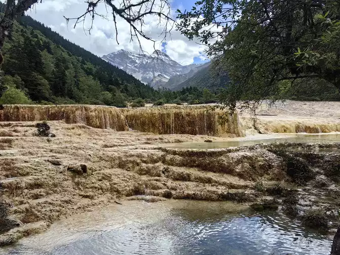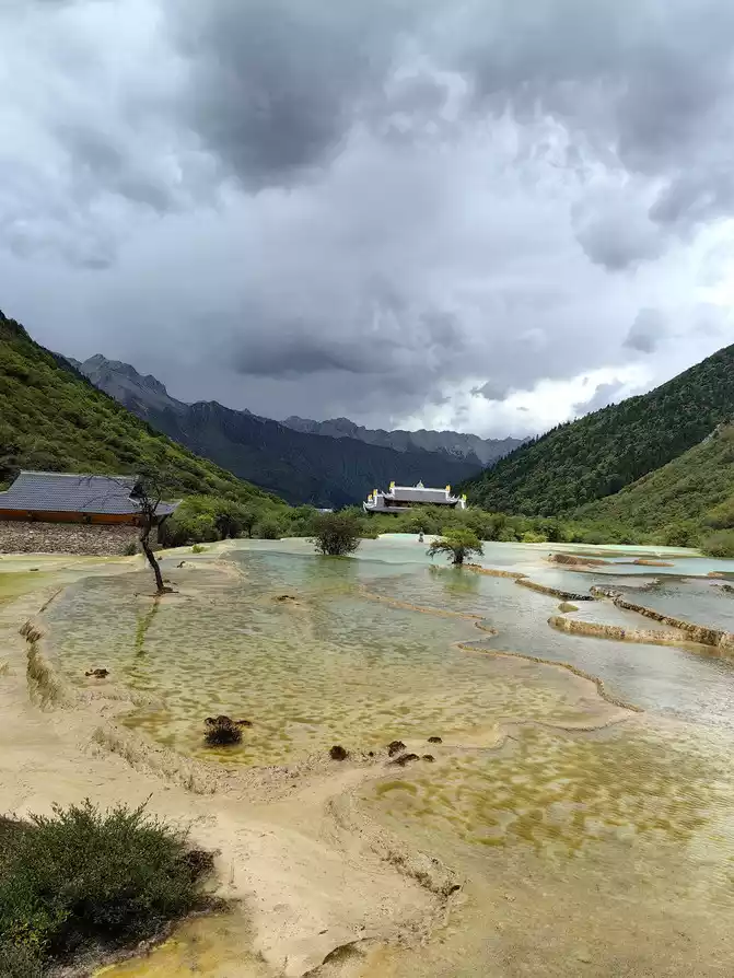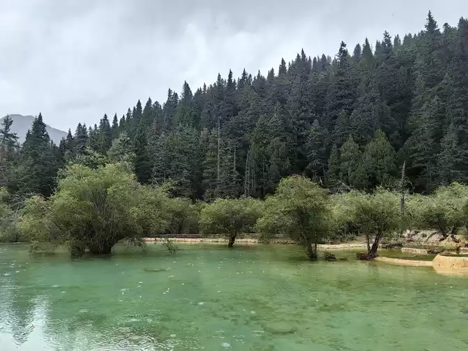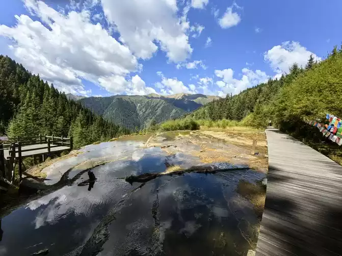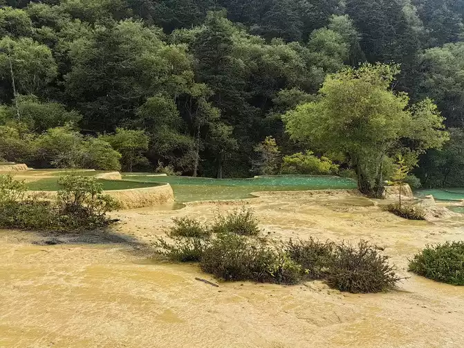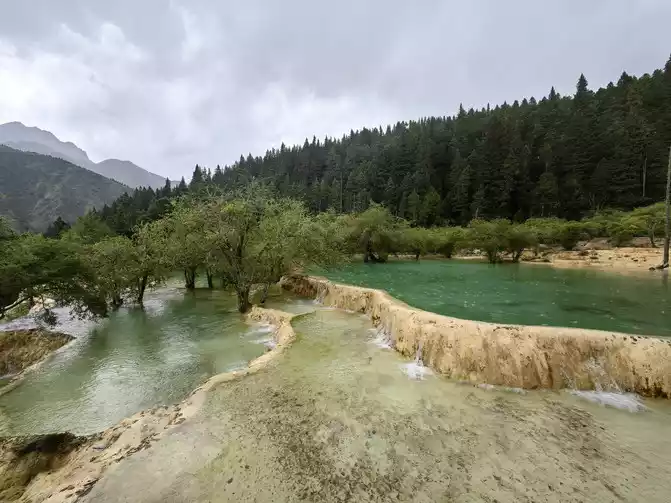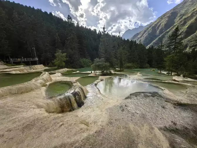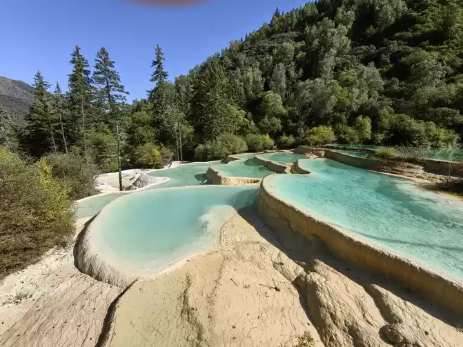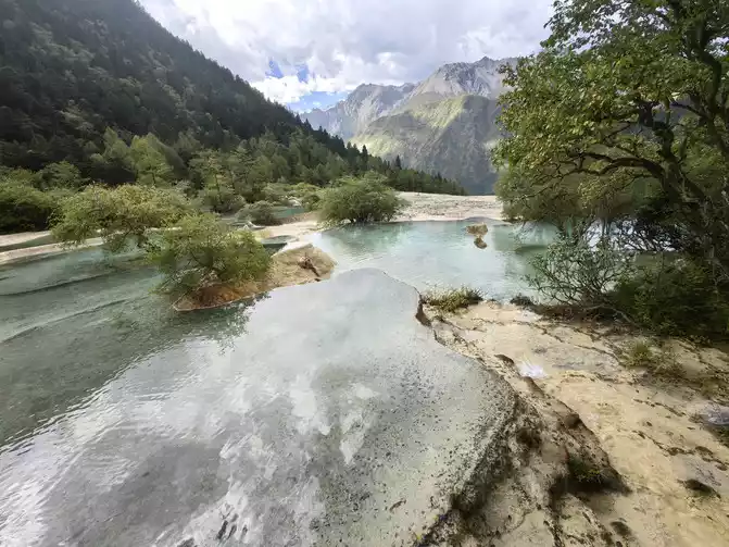 Colorful pools are a group of calcified color pools, with a total of 693 calcium pools, countless pieces of different sizes, and color pools of different shapes are like watercolor boards full of various colorful pigments, blue-green, sea blue, light blue, etc., which are gorgeous and wonderful. Walking by the pool, the green mountains are emerald, and the 5,588-meter-high main peak of Minshan Mountain, Xuebaoding, stands majestically in front of you.