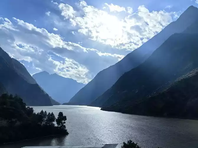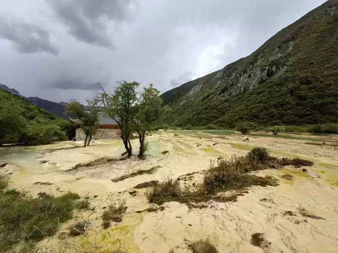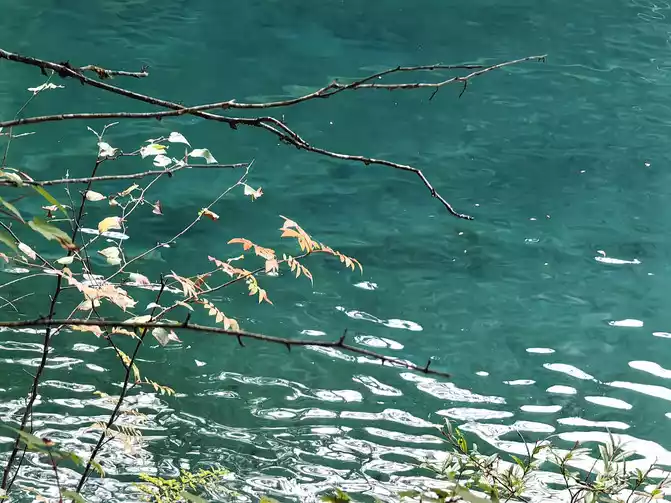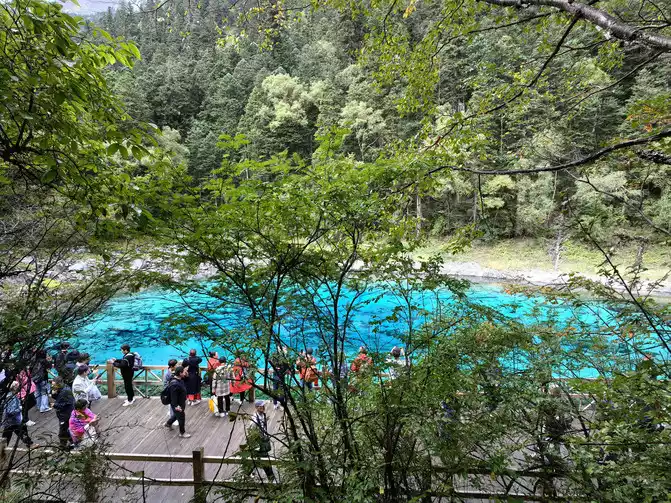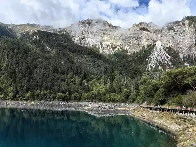 At analtitude of 2,220 meters above sea level in Wolong Sea, there is a creamy yellow travertine embankment at the bottom of the water, which looks like a dragon lying in the water, lifelike. The lake is calm and peaceful, like a smooth and flat sapphire. Wolong Sea is surrounded by flowers and trees, and in spring and summer, it is emerald green. The blue-green water of Haizi is more intense and intoxicating. When the autumn wind rises, the red leaves and green trees on the embankment are reflected in the lake and mountains, which is beautiful.