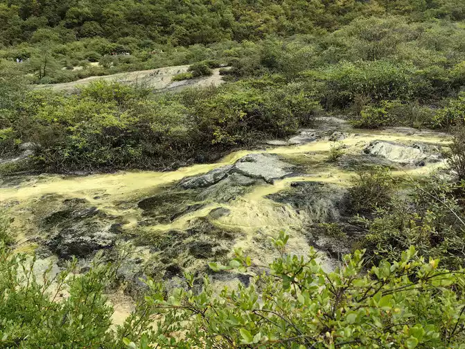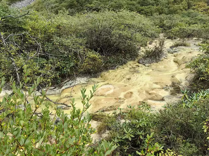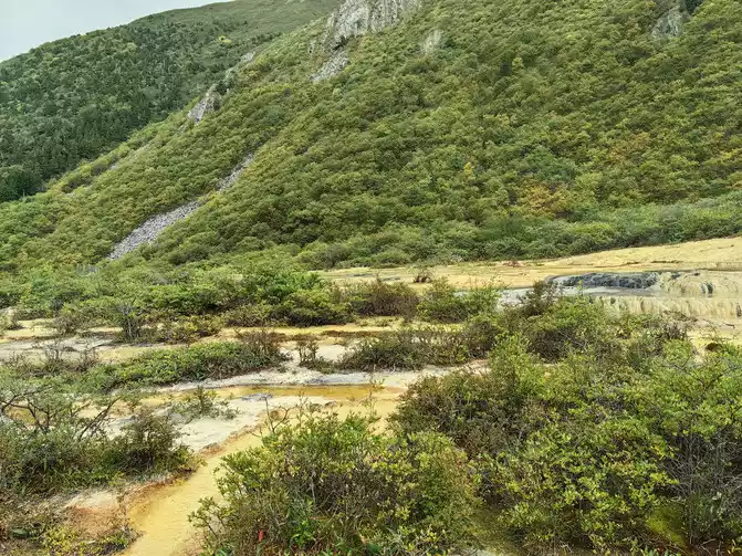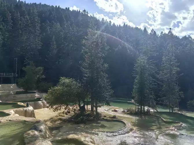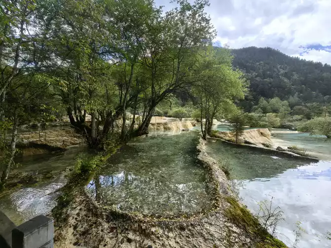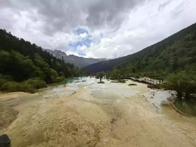 Entering the Immortal Pool Scenic Area, slowly moving forward along the plank road, surrounded by lush dense forests, the hillsides are wrapped in yellow, milky white calcium, forming a peculiar basin-shaped calcification pool and calcified slope, stacked in front of you, the water color in the pool emits a unique "Jiuzhai blue", which is very a bit of a taste of fireworks in the world.