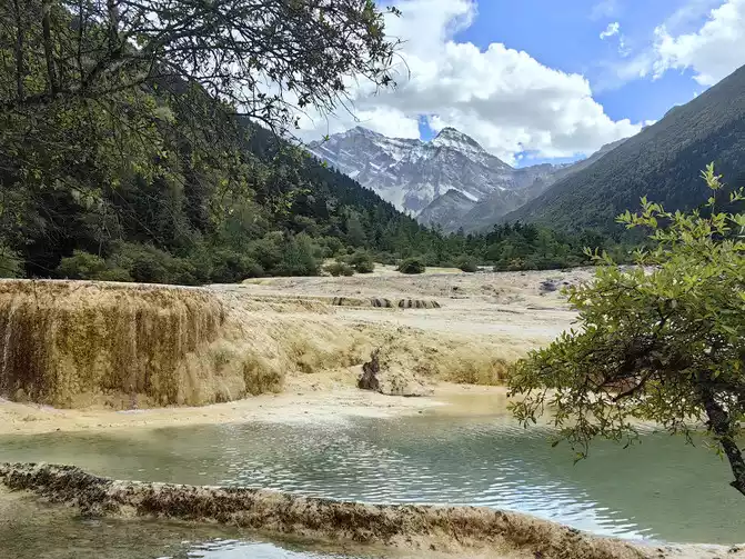 Huanglong Scenic Area is located in Songpan County, Aba Tibetan and Qiang Autonomous Prefecture, Sichuan Province, and is the only well-protected plateau wetland in China. The main landscape is concentrated in the 3.6-kilometer-long Huanglonggou, which is covered with creamy yellow carbonate travertine deposits, which looks like a yellow dragon in a dense forest valley from a distance, from which the name Huanglonggou comes from. There are more than 3,400 colorful pools arranged in the terraced shape in Huanglonggou, the longest calcified beach is 1,300 meters long and the widest is 170 meters, with a grand scale, ingenious structure and colorful surface travertine landscape as the main scene, famous at home and abroad for rare karst landforms, famous for the "four uniques" of color pools, snow-capped mountains, canyons and forests, enjoying the reputation of "world wonders", "Yaochi on earth", etc., which can be called a wonderland on earth.