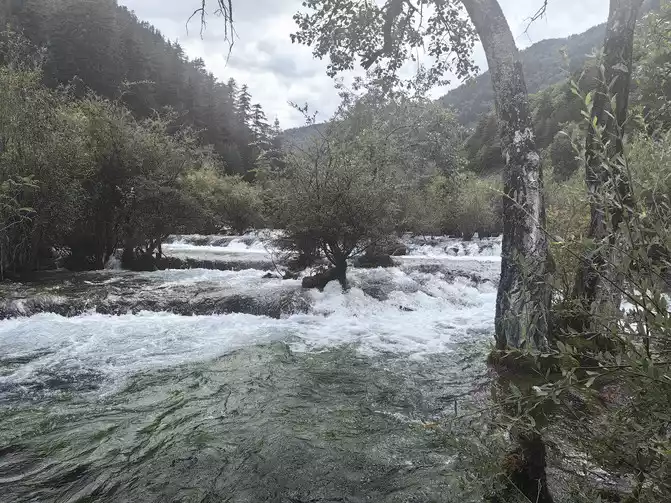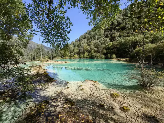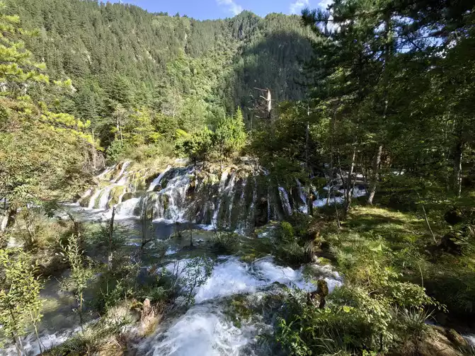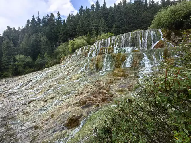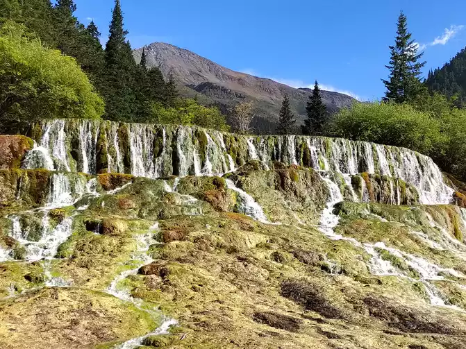 Pearl Beach is a relatively wide stone beach surface among the many lakes in Jiuzhaigou, with an altitude of 2,450 meters, and is a large travertine accumulation platform formed by calcium carbonate deposits. The clear lake water rushes down through the spacious beach, and the lake splashes silver beads on the sloping and uneven stone beach, resembling pearls, hence the name Pearl Beach. There are a large number of algae and scattered water-loving shrubs growing on the beach, and the water flow of about 100 meters long has fallen into the river valley in multiple stages, due to the action of "biological karst" and the chemical deposition in the flowing water, the beach surface is scaly and corrugated, and the clear torrent splashes countless broken waves on it, dazzling in the sun, like rolling pearls.