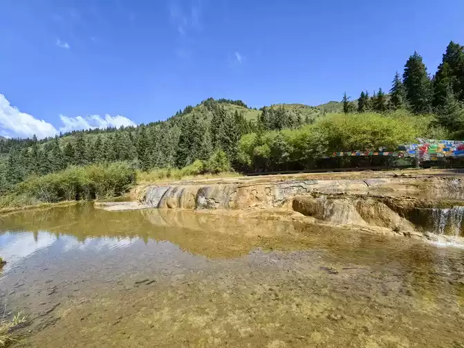 The altitude of Shuzhengqun is 2187-2280 meters, and its topography is based on the superimposed debris flow accumulation in the river valley, and then deposited by travertine, forming 19 lakes of different sizes, layered along the gully. On the embankment stands the unique shrubs of the plateau, rooted in the bottom of the water, standing proudly in the torrent, withstanding the impact of flowing water for many years without falling or rotting, forming a special plant community and a rare natural wonder in the world. Forests, lakes, and waterfalls are staggered and embedded in deep mountains and valleys, with green trees and silver waterfalls in the middle, just like bringing a beautiful jade necklace to Shuzhengzhai, presenting a peculiar landscape of "trees are born in the water, water flows in the forest, and people swim in the painting".