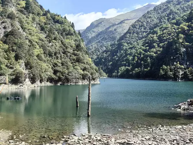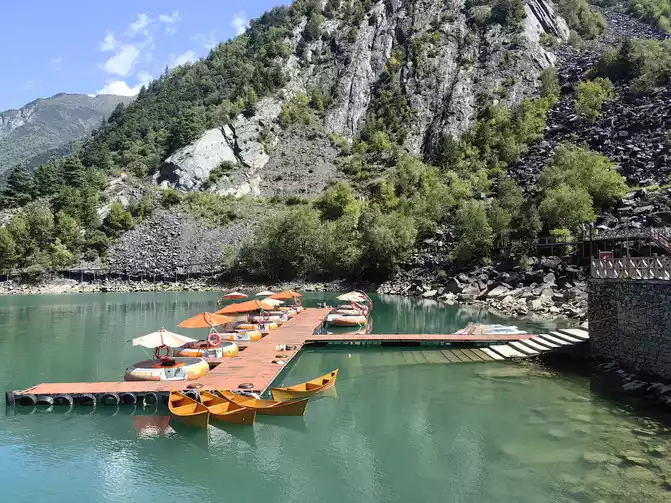 Baishi Sea is the largest sea in Diexi Songpinggou Tourist Attraction, also known as Gongpeng Sea and Walpu Sea, named after a mysterious white stone on the seaside. The shape of the sea is like a flat scythe, the tip is the deepest, and the gap between the cliff is heartbreakingly green, the lake is blue and cloudy, and the green mountains and forests are reflected in it.