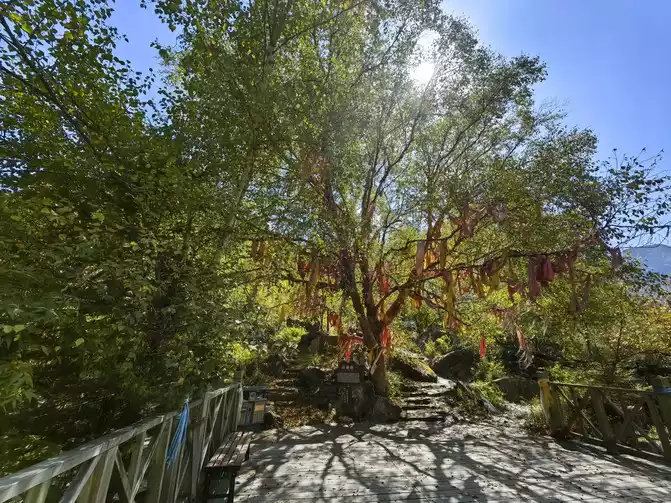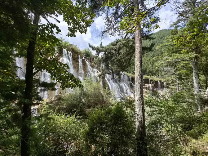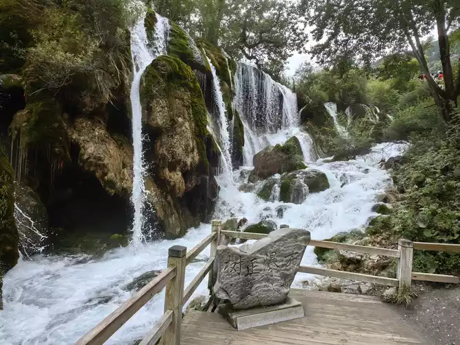 With an allocation of 2,365 meters, a width of 270 meters and a height of 24.5 meters, Nuorilang Waterfall is one of the largest calcified waterfalls in China and the widest waterfall in China. Nozhilang Waterfall means majestic waterfall in Tibetan, it falls in multiple stages, and a water curtain 140 meters wide flies out from between the two mountains and falls straight down to a hundred-foot cliff, forming a rare forest waterfall. There is an observation deck built opposite the waterfall, standing on the platform, the panoramic view of the waterfall is overlooked, and the 300-meter waterfall is set off by the clouds and mist, turning into a magnificent picture. Many film and television dramas have been filmed here, and the ending of the 1986 version of the TV series "Journey to the West" was filmed here.