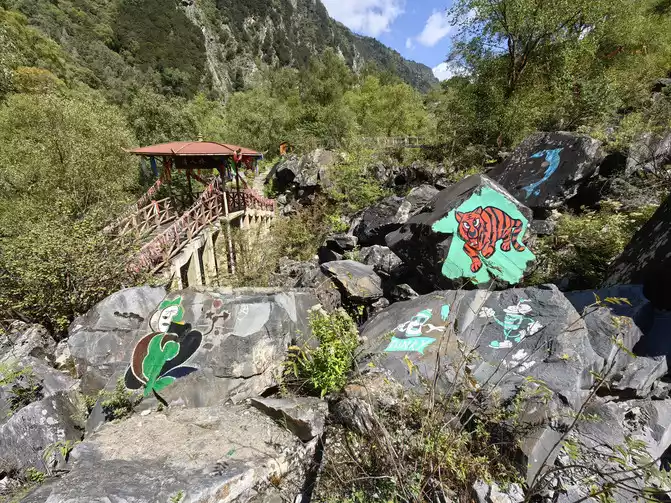 Meandering down the winding plank road, a group of exquisite and unique pools with bright water quality come into view, which is the welcome pool. The pools are of different sizes, peculiar shapes, bright colors, and staggered, surrounded by mountains, lush trees, wildflowers blooming in the mountains, and colorful butterflies flying. The stone paths in the mountains twist and turn, dotted with viewing pavilions, adding to the interest.