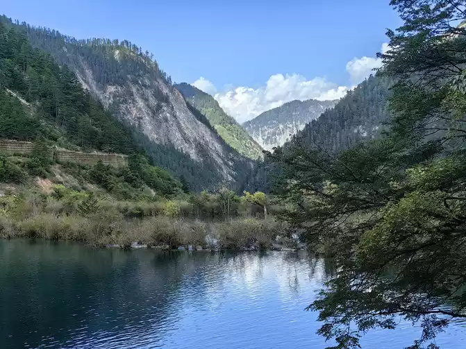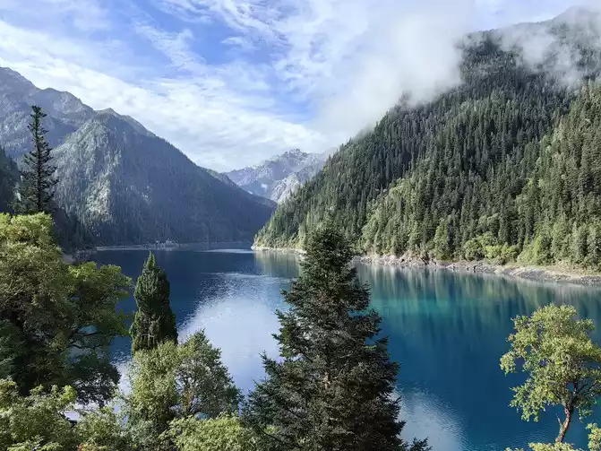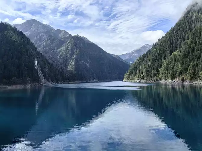 At an altitude of 3,150 meters, Changhai is the longest lake in Jiuzhaigou, about 5 kilometers long, dark blue, and distributed in an "S" shape. The surrounding mountains are stacked and the trees on the shore are dense, and at a glance, the water is like a mirror, the majestic snow peaks, bathed in the blue sky and white clouds, spectacular and beautiful. Changhai can also be regarded as the mother of all the Haizi in Jiuzhaigou, because Changhai has no water outlet, and can only rely on evaporation and underground rivers to discharge water, and these underground rivers are an important supply of water sources from other Haizi.