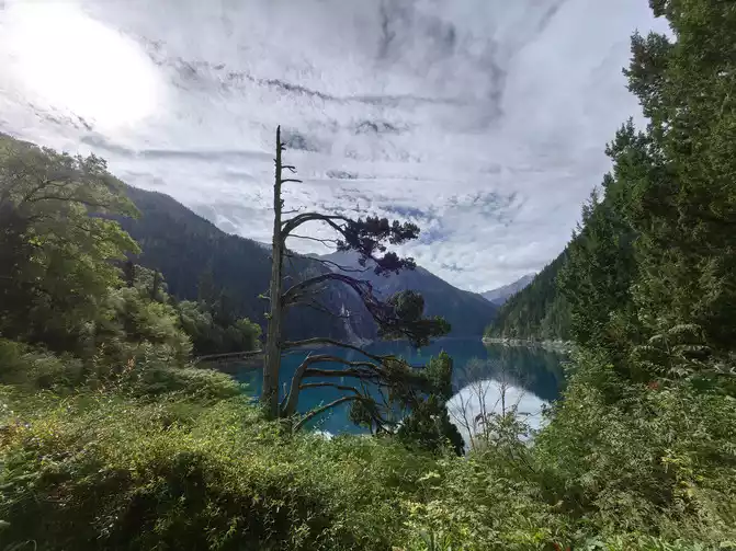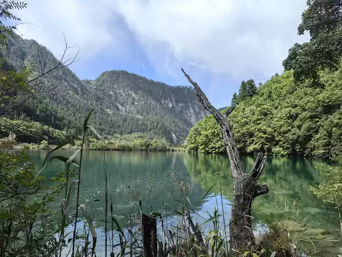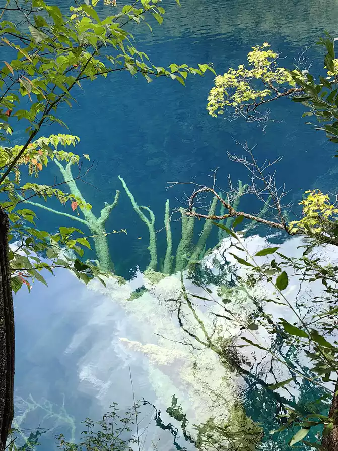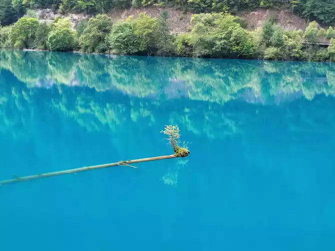 Shuanglong Sea is 2,200 meters above sea level, surrounded by countless tall trees, and there are a large number of dead trees and broken branches at the bottom of the water. On the indigo water, the dark yellow dead trees also sprouted clusters of exquisite, beautiful and verdant plants, which can be described as dead trees in spring, a vibrant scene, making people feel the power of nature and traces of history.