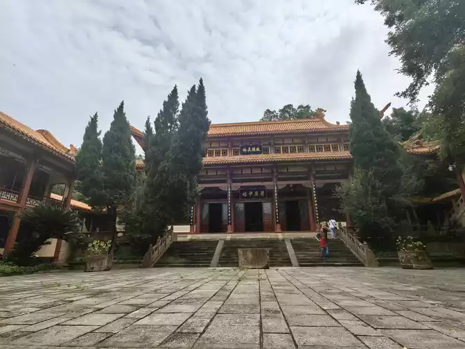 We took the sightseeing bus from the visitor center to the ropeway station, then took the cable car up the mountain and transferred to the sightseeing bus to Huanglong Temple. Go up the stone steps and first reach the Moon Reflection Pool.