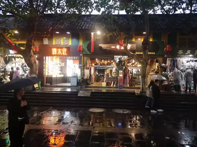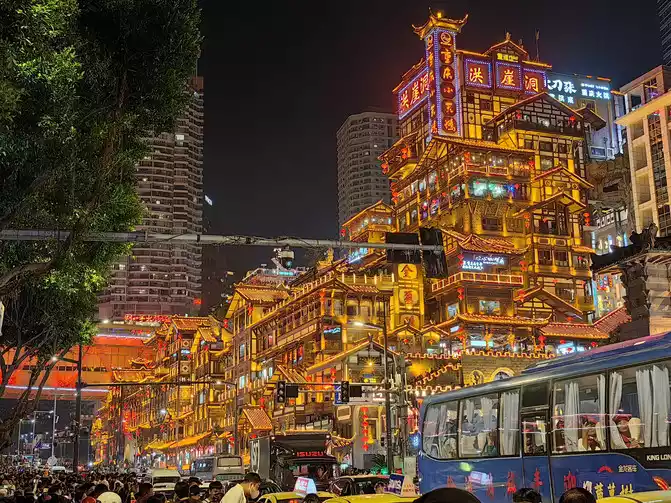 are more idle shops and unscrupulous merchants than in Chengdu, so I ordered a bowl of chicken noodle soup, urged three times to bring a bowl of raw noodles, and then returned to the pot to soak it in noodle soup, and the chicken soup was nowhere to be found. At night, the lights are brilliant, like torches canning the sky,