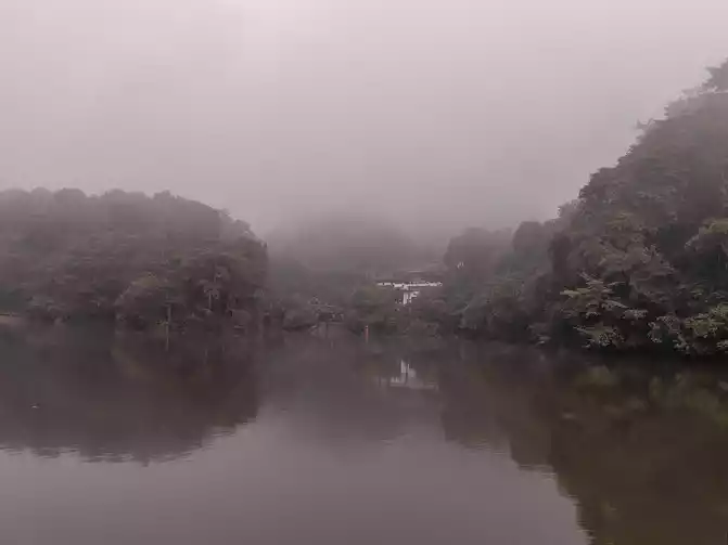 flowing water connects to the stream, and the clouds seal the ancient trees.