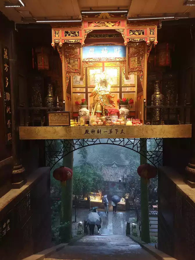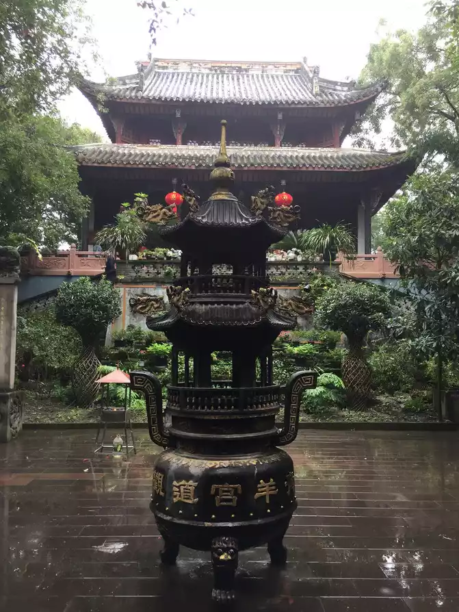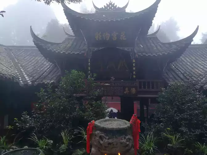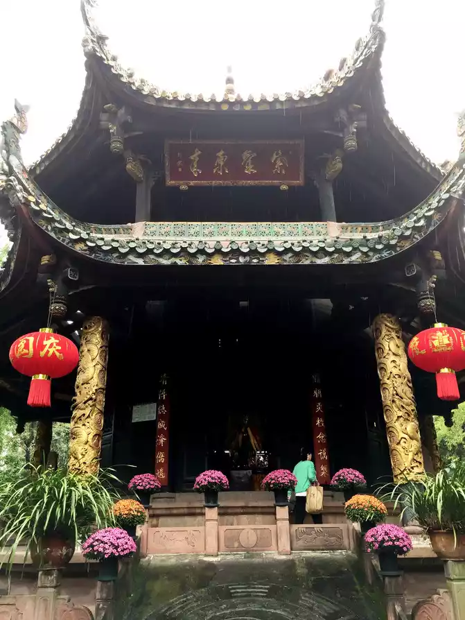 Qingyang Palace, Taoist temple, is located in the city. The sky is overcast. The main building in front of the Lao Tzu sitting hall, like a pavilion with many corners, the main hall gives way to the Three Qing gods. The carved beams and white walls are adorned with intricate patterns, adorned with blue jade and sparse ornaments.