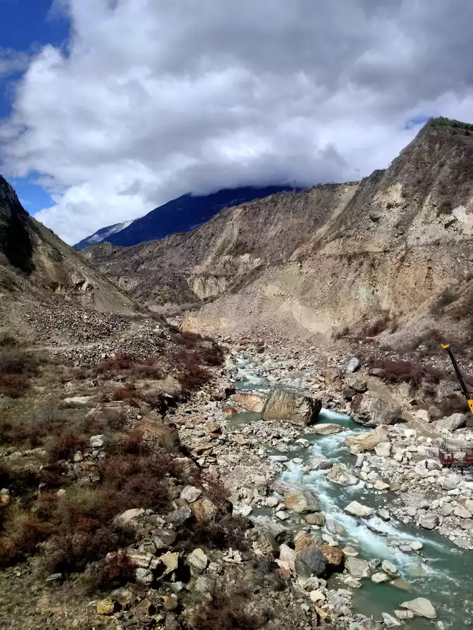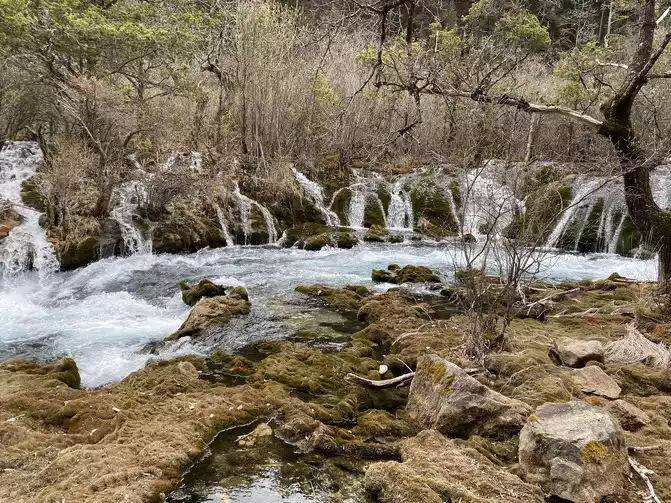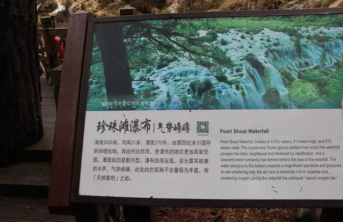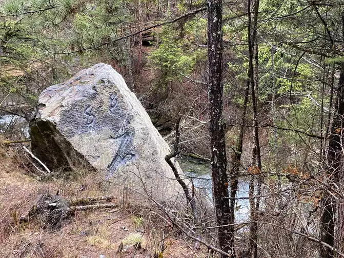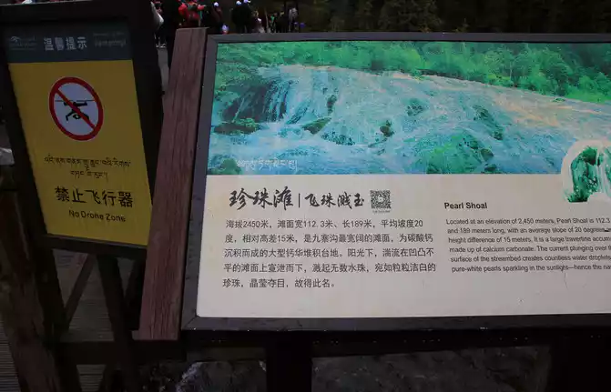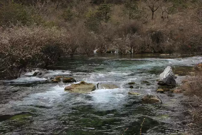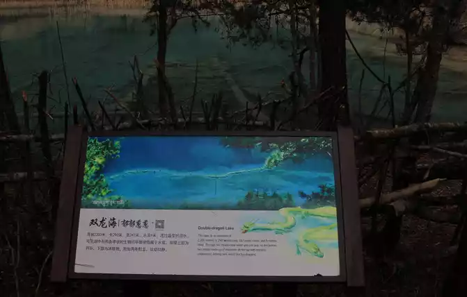 This boulder is known as the 8.8 "earthquake" stone. On August 8, 2017, a magnitude 7.0 earthquake occurred in Jiuzhaigou, which caused a high-level collapse, and the boulder rolled down from an altitude of 2,654 meters to this river valley, with a vertical drop of 272 meters. The stone is 9.2 meters high and weighs about 522 tons, and is a dolomitic limestone, which was formed in the marine environment for 320 million years, and the boulder has witnessed the vicissitudes of Jiuzhaigou. The 8.8 earthquake caused the boulder to break away from the mountain and roll down, destroying all the vegetation along the way and forming a huge trench. This boulder is inscribed to warn mankind to revere nature.