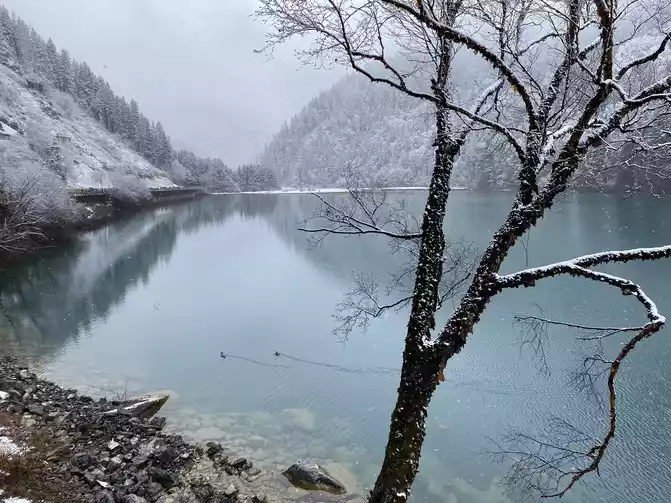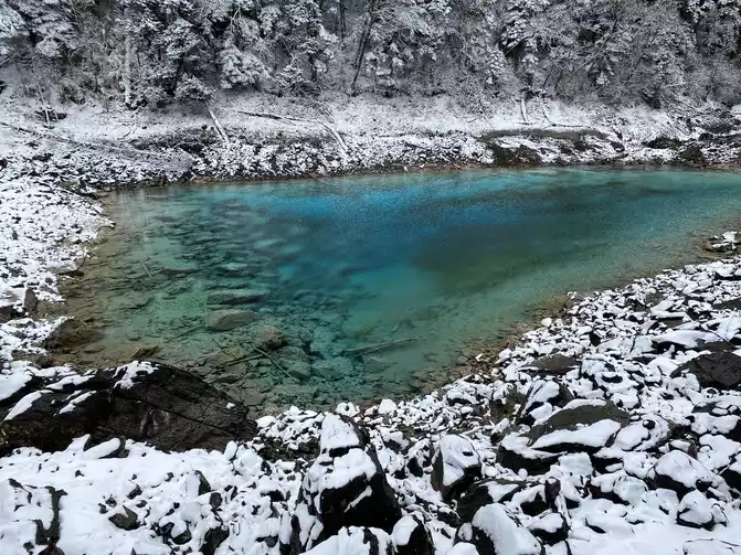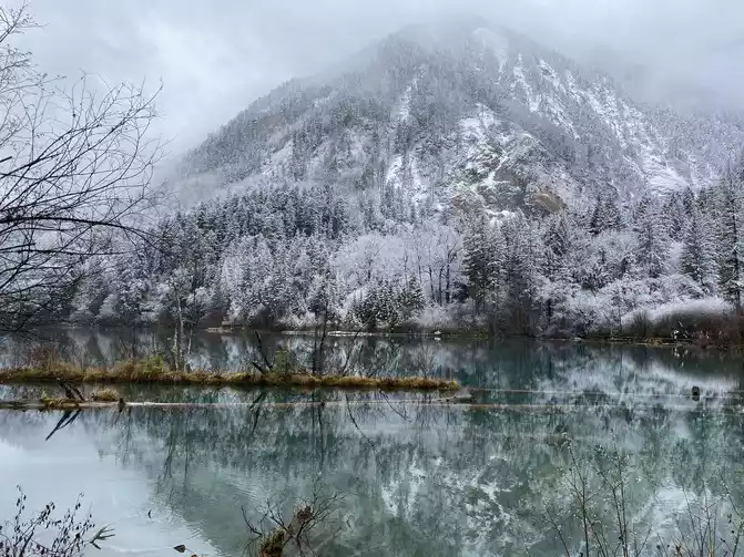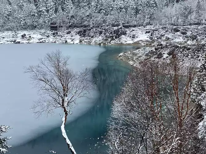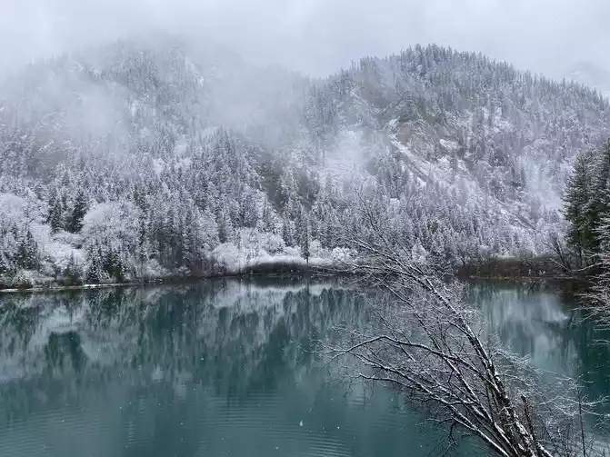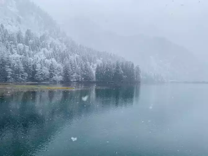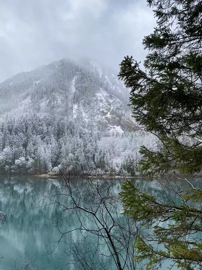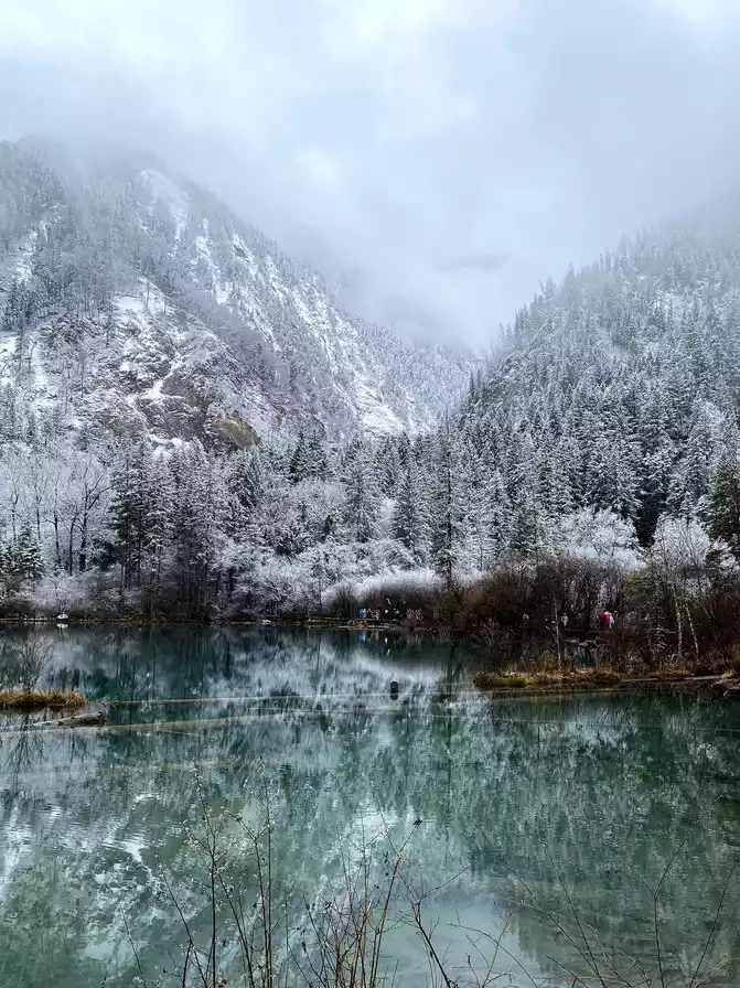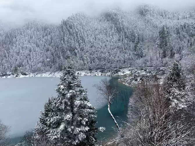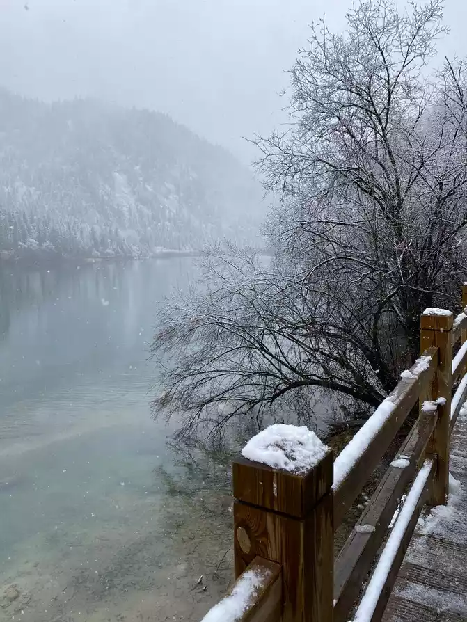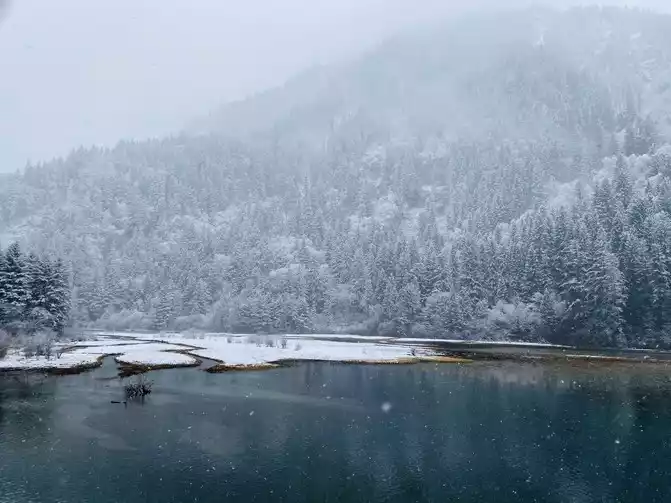 Although there are no blue skies and white clouds today, there are layers of white snow covering the green forest, which makes the sea in front of you more attractive!