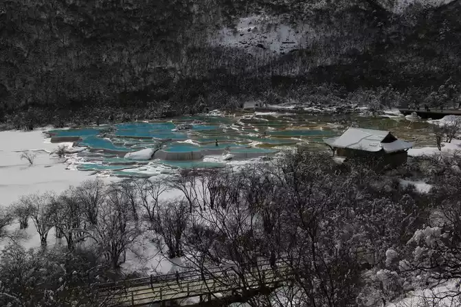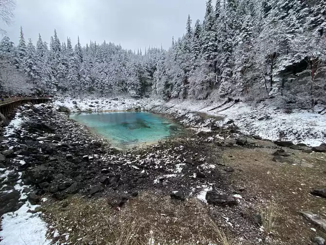 takes about 10 minutes by car to reach the stop near the colorful pond. As far as the eye could see, it seemed that heavy snow covered the entire pool in Huanglonggou, and at this time I even doubted whether I could see the beautiful "Yaochi on Earth".