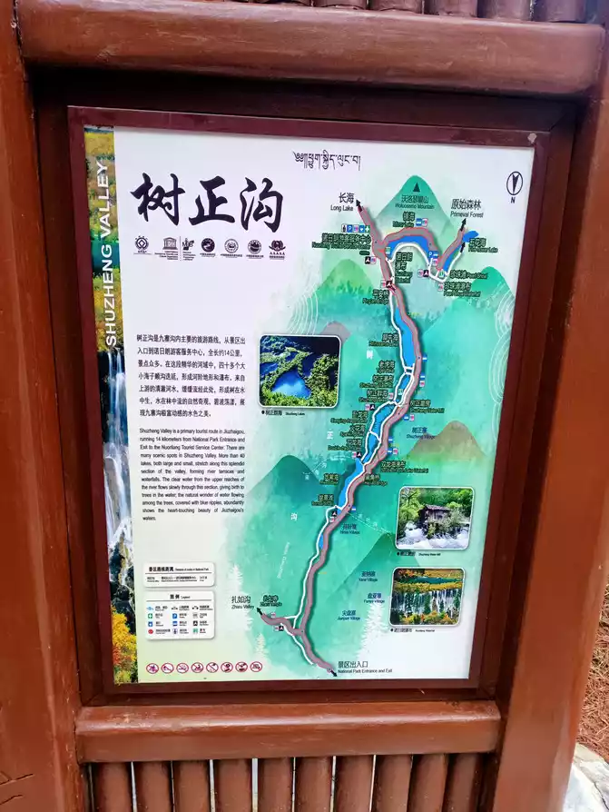 At 8:48 a.m., we arrived at the gate of Jiuzhaigou Scenic Area.The above picture is the Y-shaped tour map of Jiuzhaigou Scenic Area, we take the scenic bus (buy tickets to enter the scenic spot, you don't need to buy a separate ticket for the bus) to visit the scenic spots: take a bus from the gate of Jiuzhaigou Scenic Area to Nuorilang Transfer Station and transfer to the right line bus to Jianzhu Sea and visit---- take a bus to Panda Sea and visit---- take a bus to Wuhua Sea and visit---- walk to Pearl Beach and visit---- walk to Pearl Beach Waterfall and visit ---- Mirror Sea (solve lunch) ---- walk to Nuorilang Transfer Station, take the left bus to Changhai and visit---- walk to Wucai Pond and visit---- take a bus to Nuorilang Transfer Station---- visit Nuorilang Waterfall---- take a bus to Rhino Sea and visit---- walk to Tiger Sea and visit---- walk to Shuzheng Waterfall and visit ---- walk to Shuzheng Sea and visit---- take a bus to Shuangzheng Sea and visit---- walk to Shuanglong Sea and Shuanglonghai Waterfall and visit---- take a bus to Bonsai Beach and visit---- take a bus back to the entrance and exit of Jiuzhaigou Gate 。