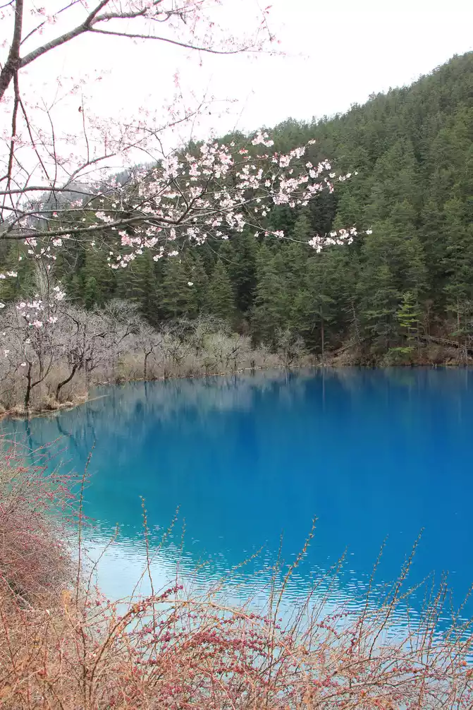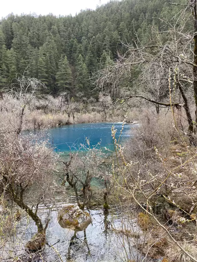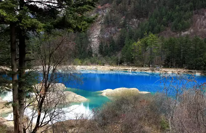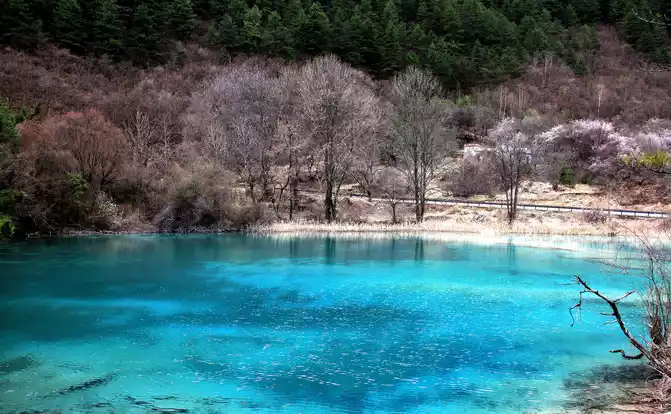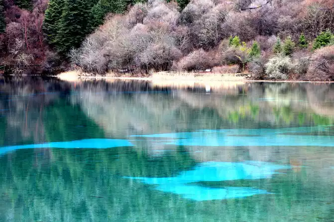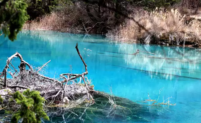 Wuhuahai is the most colorful sea in Jiuzhaigou, mainly because the travertine, algae, aquatic plants, and dead trees at the bottom of the lake are reflected and refracted by different lights, plus the blue sky, white clouds, green grass, and green forests reflected in the lake, forming earth yellow, emerald green, snow white, blue-green, navy blue and green and other colors intertwined in the lake. This is my favorite Haizi on this trip.