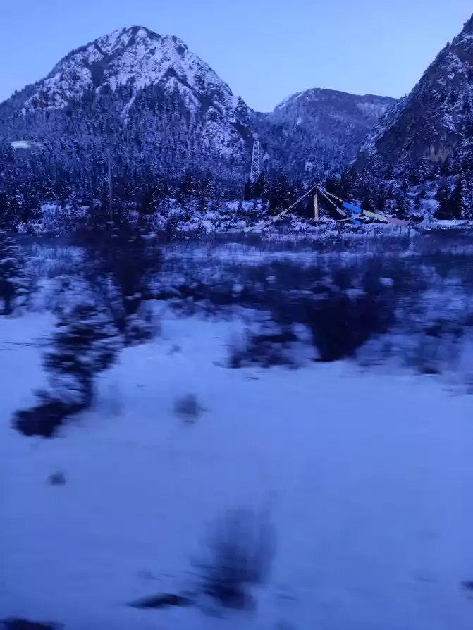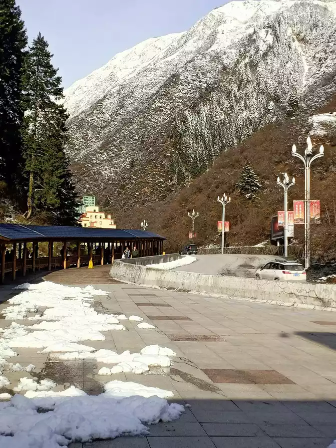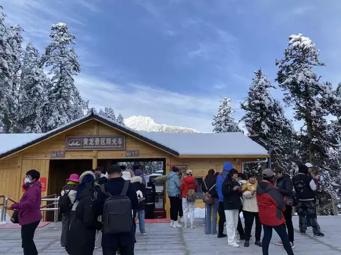 20230324 visit Huanglong and then return to the city. Because I heard that the road to Huanglong Scenic Area was very congested yesterday, coupled with heavy snowfall, many tour groups canceled their Huanglong tour plans yesterday. For this reason, our tour guide was worried that the traffic jam would delay the tour, so it was recommended to leave early this morning to Huanglong Scenic Area, so we set off at about 6:00, and the car drove here at about 7:00 in the morning, and it was snowy outside the car window, but there seemed to be some morning light reflection on the top of the snow-capped mountain, and I felt that today was a good weather.
