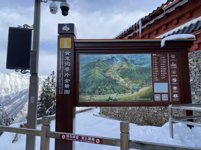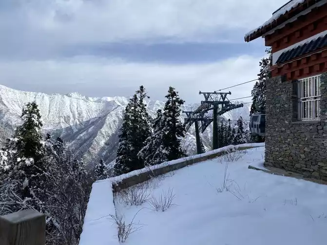 arrived at the ropeway station at 8:41. If time permits, you can walk into the Huanglong Scenic Area here. Look at the ice picks hanging on the eaves and the snow all over the mountains in the distance, you can see how cold the yellow dragon is today, this is really cold.