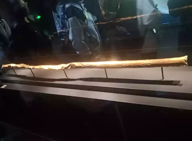 merchant staff in the complex!This cultural relic is a gold artifact of the Shang Dynasty, and the golden staff is beaten into gold skin with gold bars, and then wrapped on the wooden cane; At one end of the golden staff, there is a pattern, which is divided into three groups: the group near the end, which is seen as two symmetrical figures with five teeth and triangular earrings. The other two groups have the same pattern, and the upper and lower parts are birds and fish with opposite backs.